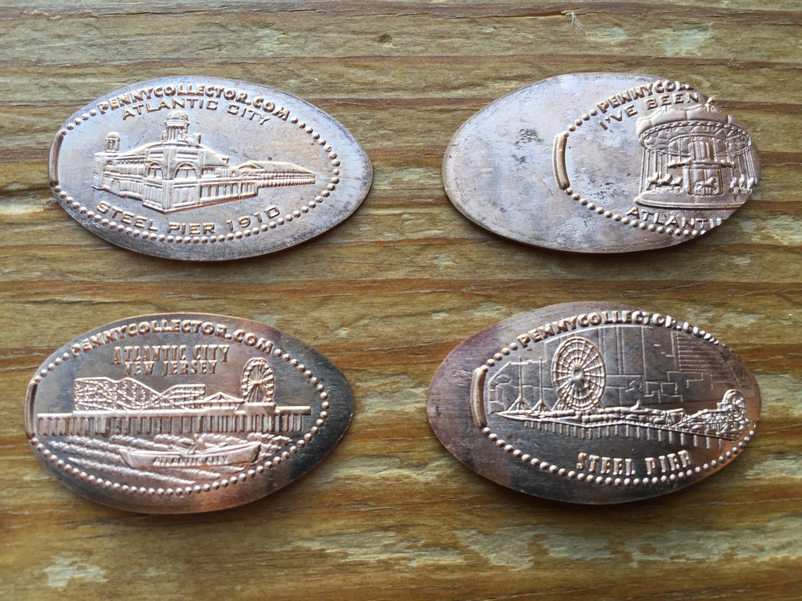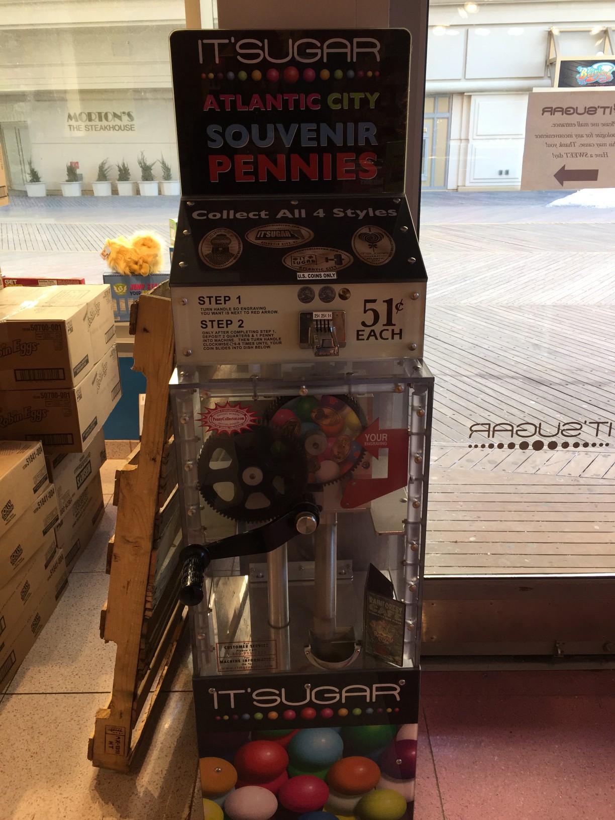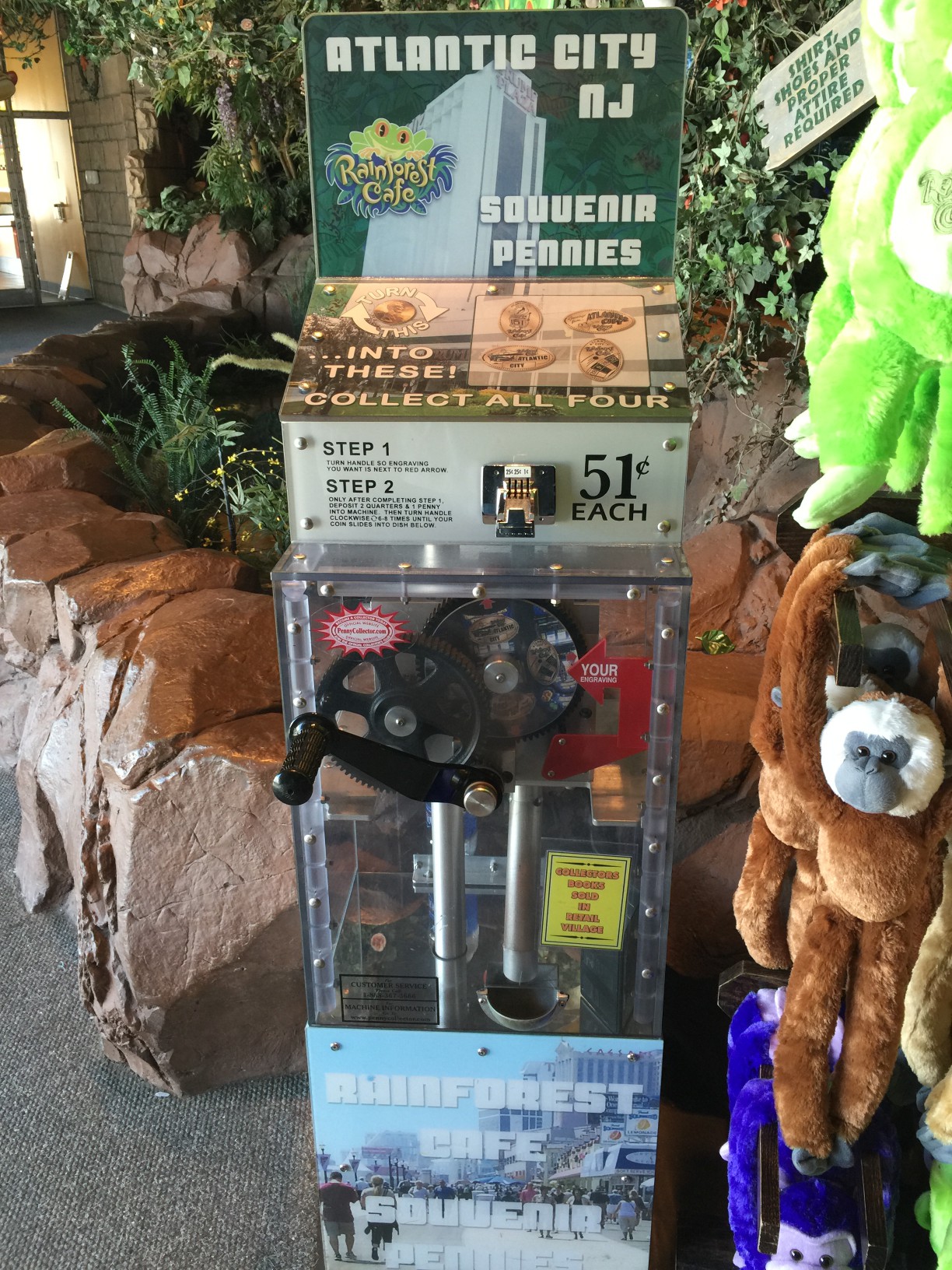Atlantic City is only a about an hour and a half away from our house, and we aren’t huge gamblers but it does make for a nice (not to far from home) getaway. I had booked a room at Caesar’s with a gorgeous ocean view, but we had places to go and things to see. Our dinner reservations weren’t until later in the evening so we decided to talk a walk along the boardwalk. This obviously isn’t peak beach season in Jersey so most of the stands and merchants along the boardwalk were closed, but spending time together was really the main reason we were there. There are many amazing reasons I love my wife and one of them that always surprises me is her understanding of my pressed coin obsession. While we walked along the boardwalk we stopped near the Taj Mahal casino and all of a sudden my wife said “Hey isn’t that ta penny machine?” I knew there were some machines in AC which I had collected years past and was caught off guard that there were new machines and new designs. Luckily I always carry extra change just for these type of encounters.