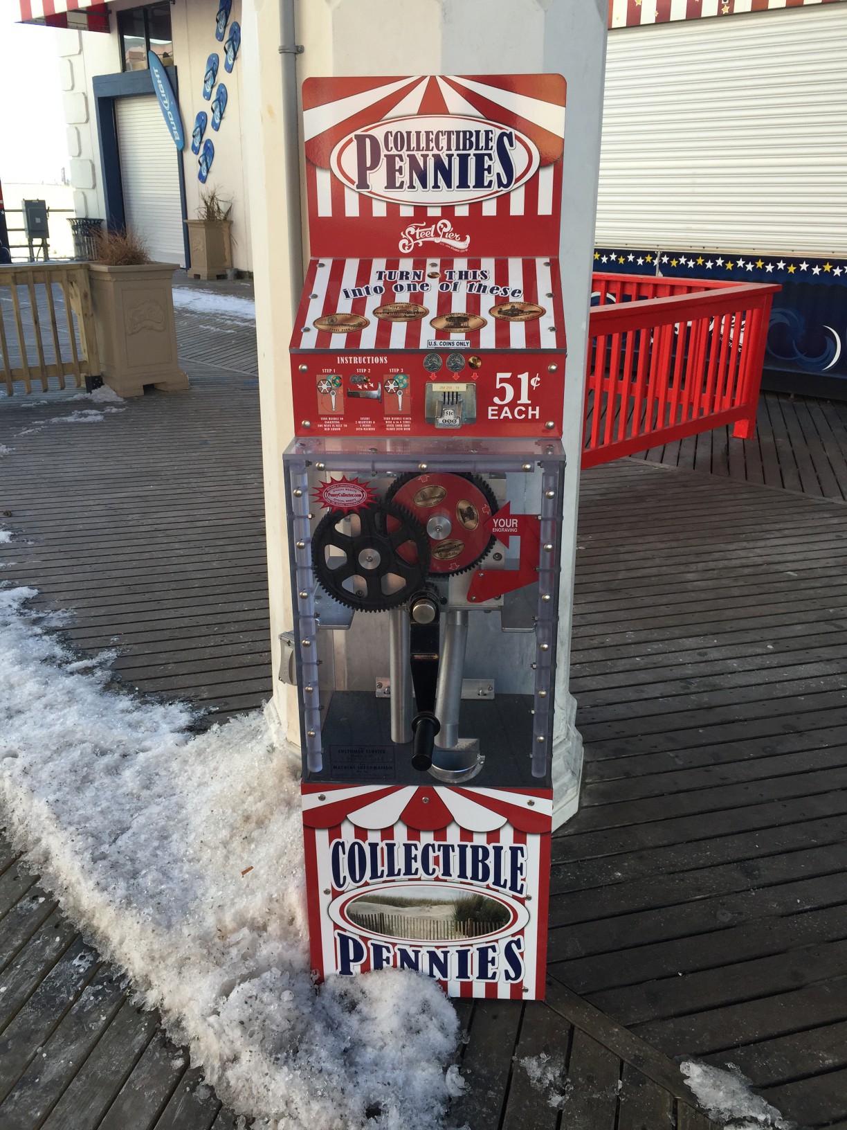 After filling up on some much needed sugar we continued walking through the mall and towards the end of the pier there was a round sitting area with an elevator. As we sat down for a quick rest my wife pointed out another penny machine next to the elevator. I walked over and pressed the set.
