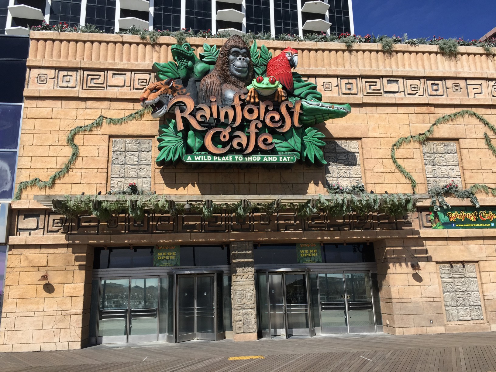 The coins had designs of the Atlantic City skyline, a pot of coins, the Beach Patrol, and dice. As we headed out of the Pier Shops we got back on the boardwalk we noticed a familiar sign. We walked a little further down the boardwalk and went inside the Rainforest Cafe.