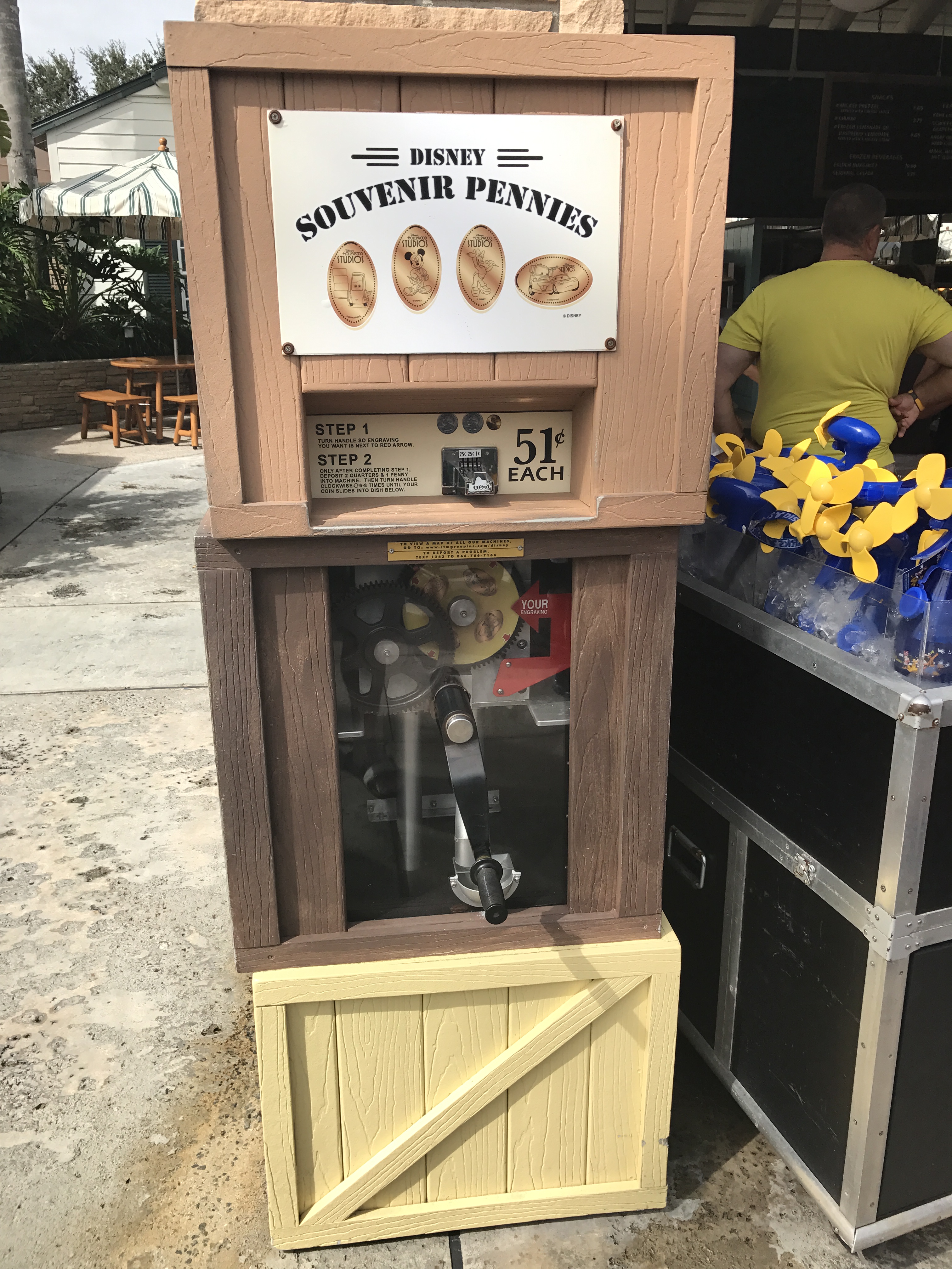 There is no “express” option to take you directly to the Studios, so it can take a little while to visit the other resorts first but it’s actually a very nice method of getting to the park. Once we arrived we got off the boat and headed inside, and right down the main boulevard. We had no fastpasses booked and nothing particularly planned for this day so we wanted to just wander around and see what we could find to do. Just outside the Indiana Jones Stunt Spectacular were the first couple penny machines.