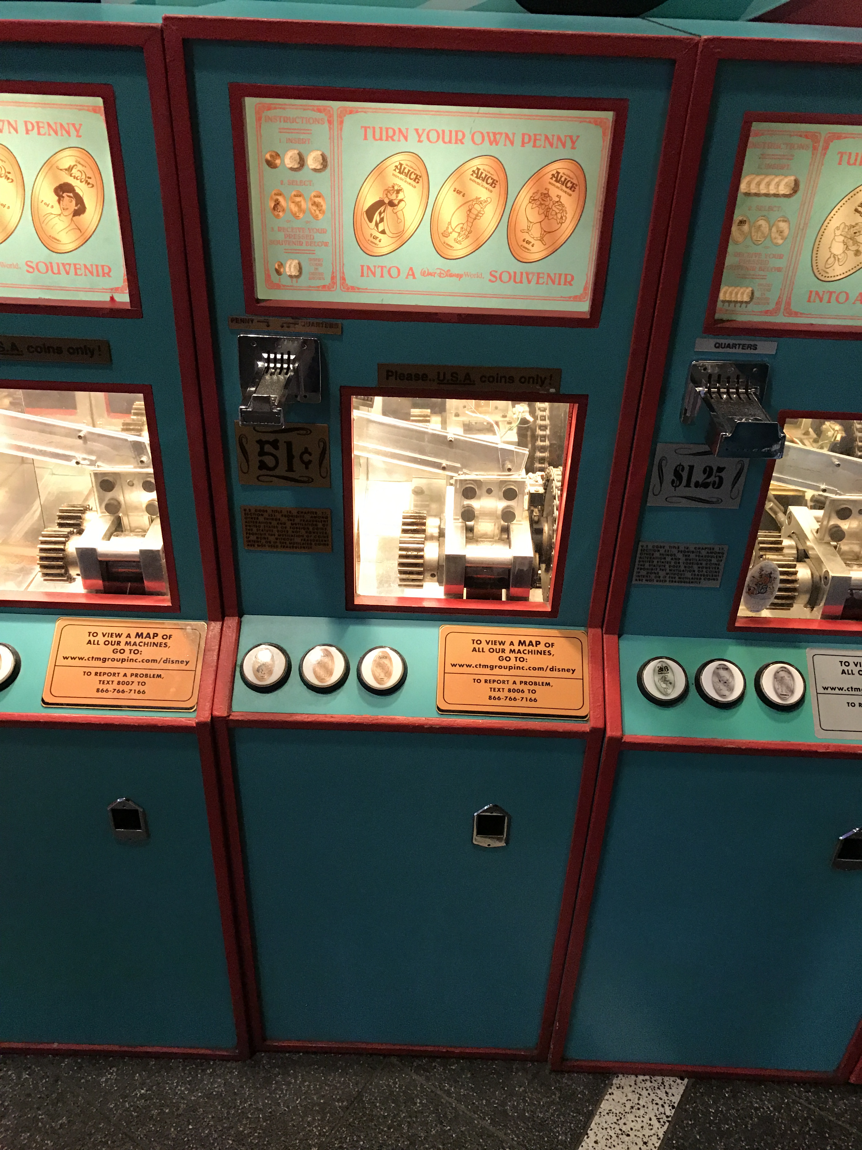 The pennies in this machine had designs of Chick Hicks from Pixar’s Cars, Donald Goofy & Mickey with Mickey Hats, and Luigi from Pixar’s Cars.
