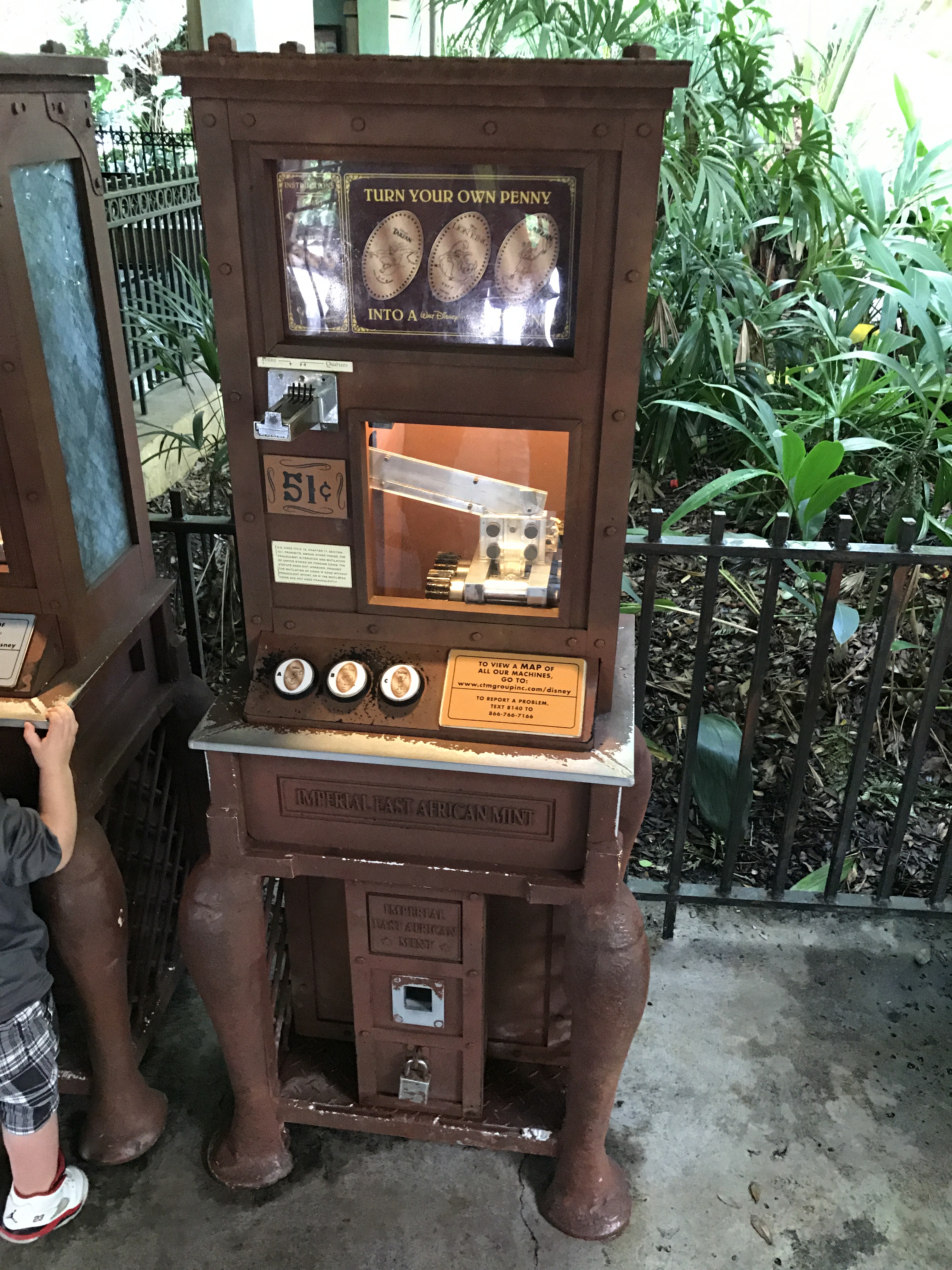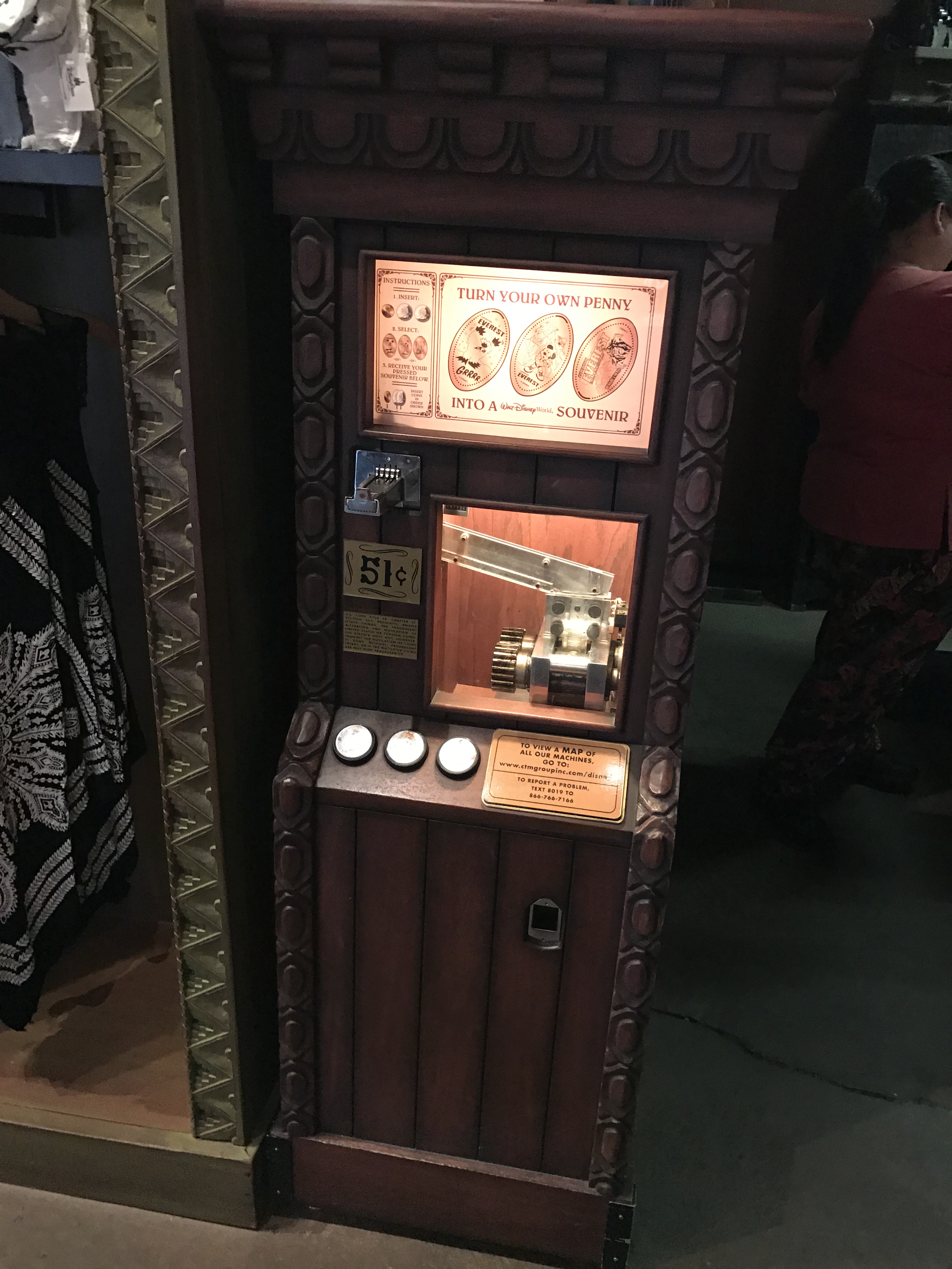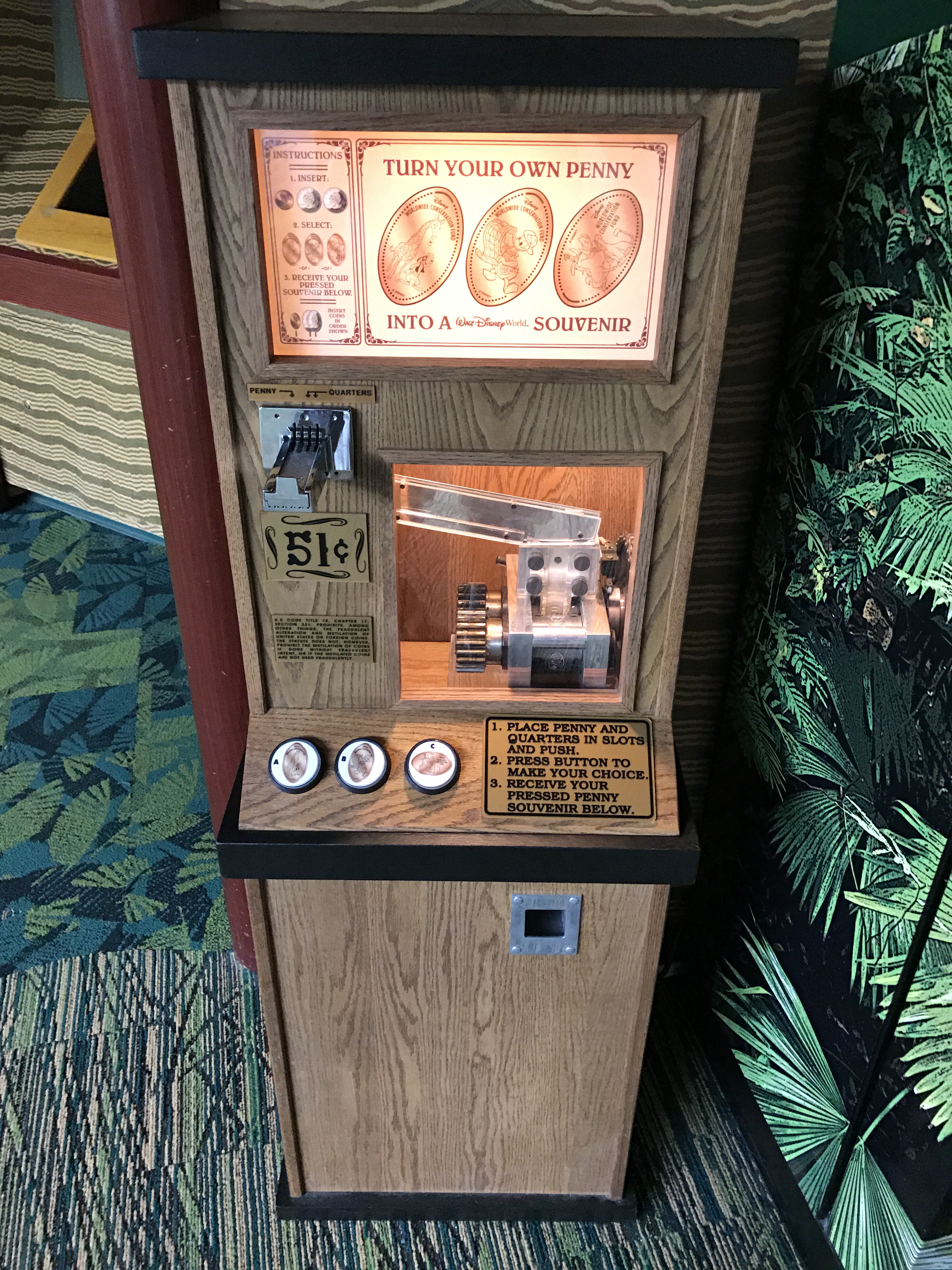 Inside the Boardwalk Resort just near the main lobby is a set of elevators and right there you will find the two penny machines. The cabinets of these machines are pretty cool looking and look like they came out of Atlantic City in the ’20s. the first machine has images of Chip, Winnie the Pooh, and an Elephant squirting Donald Duck.