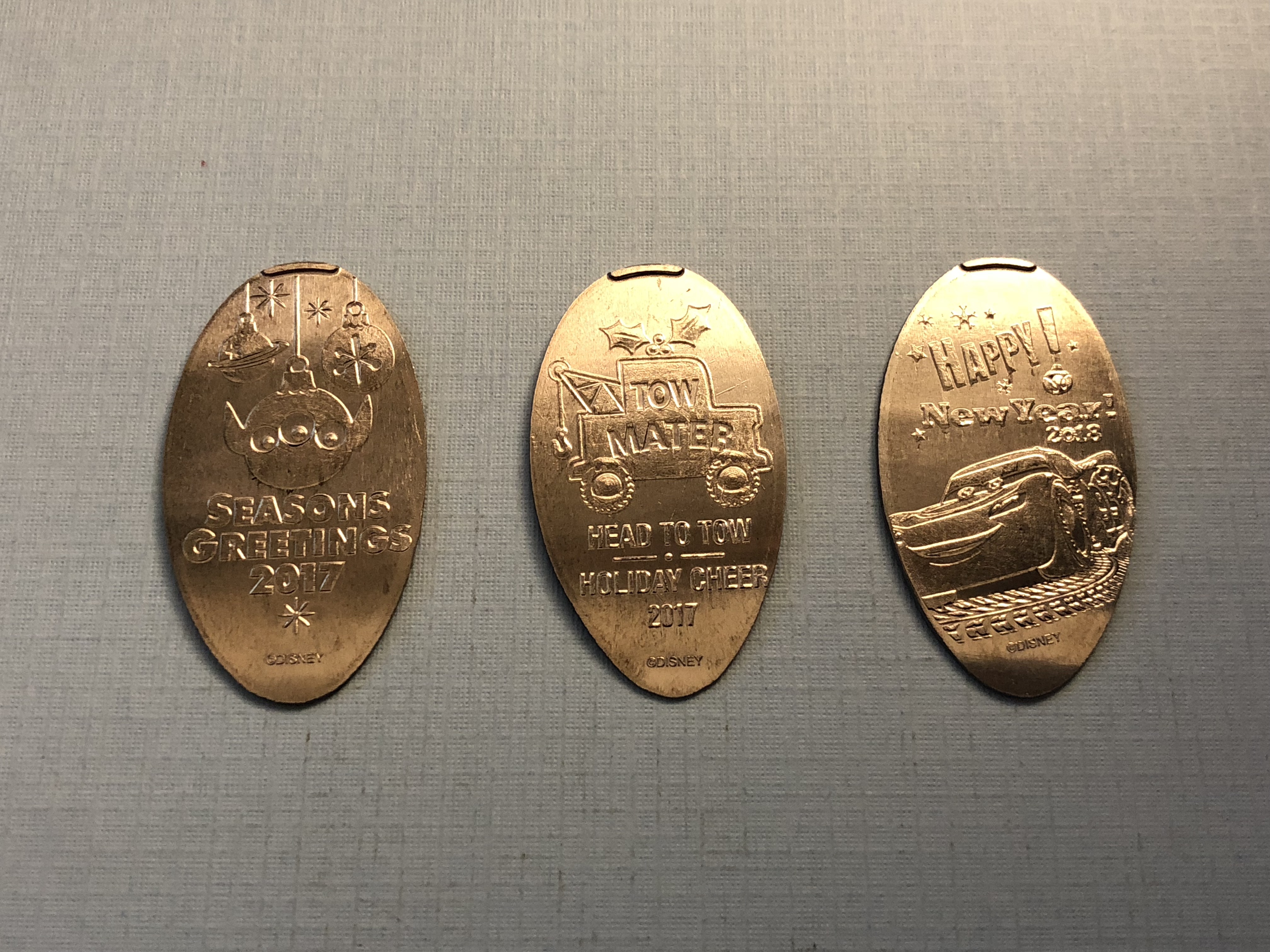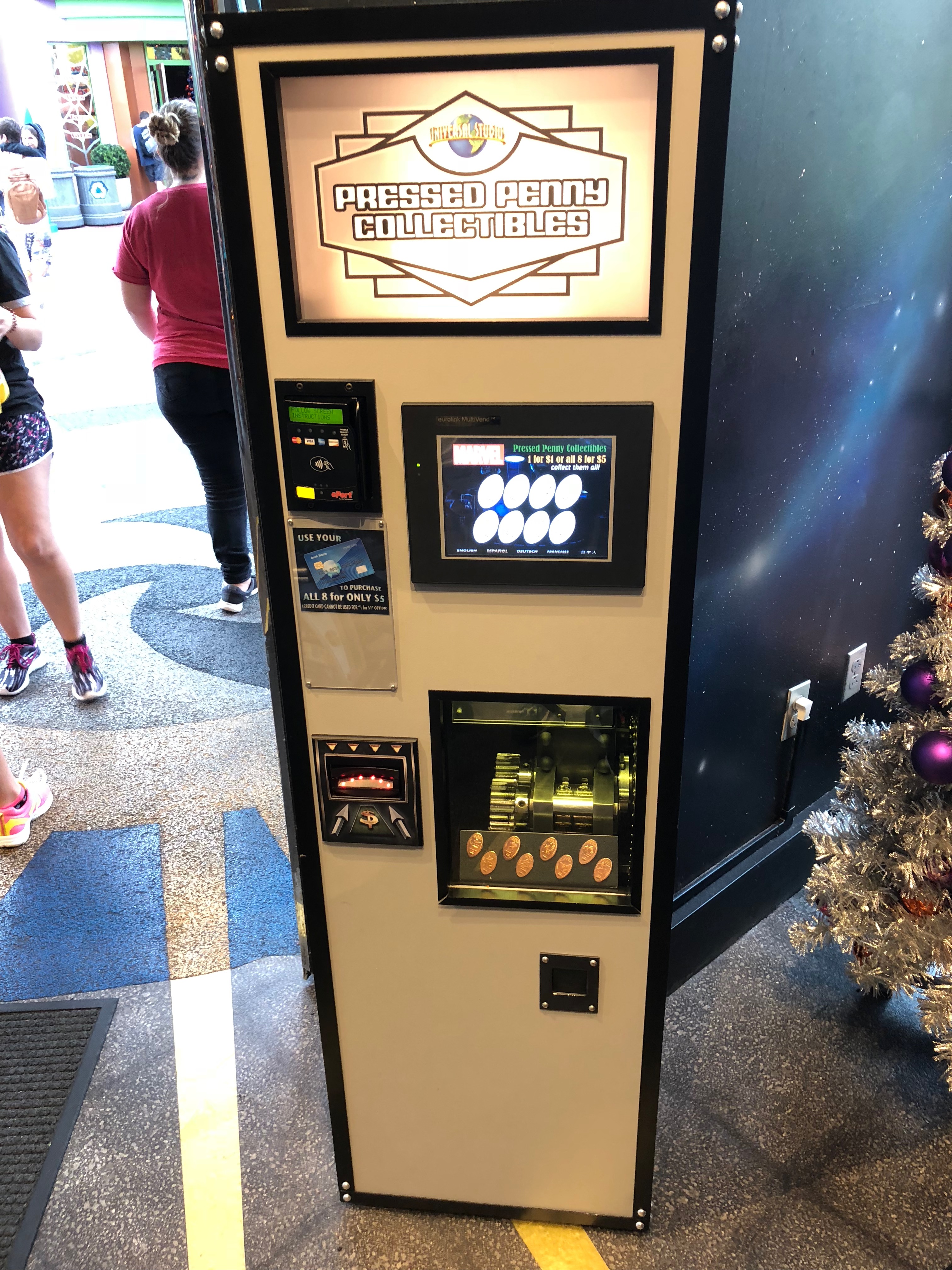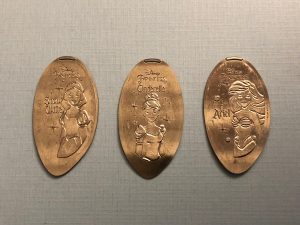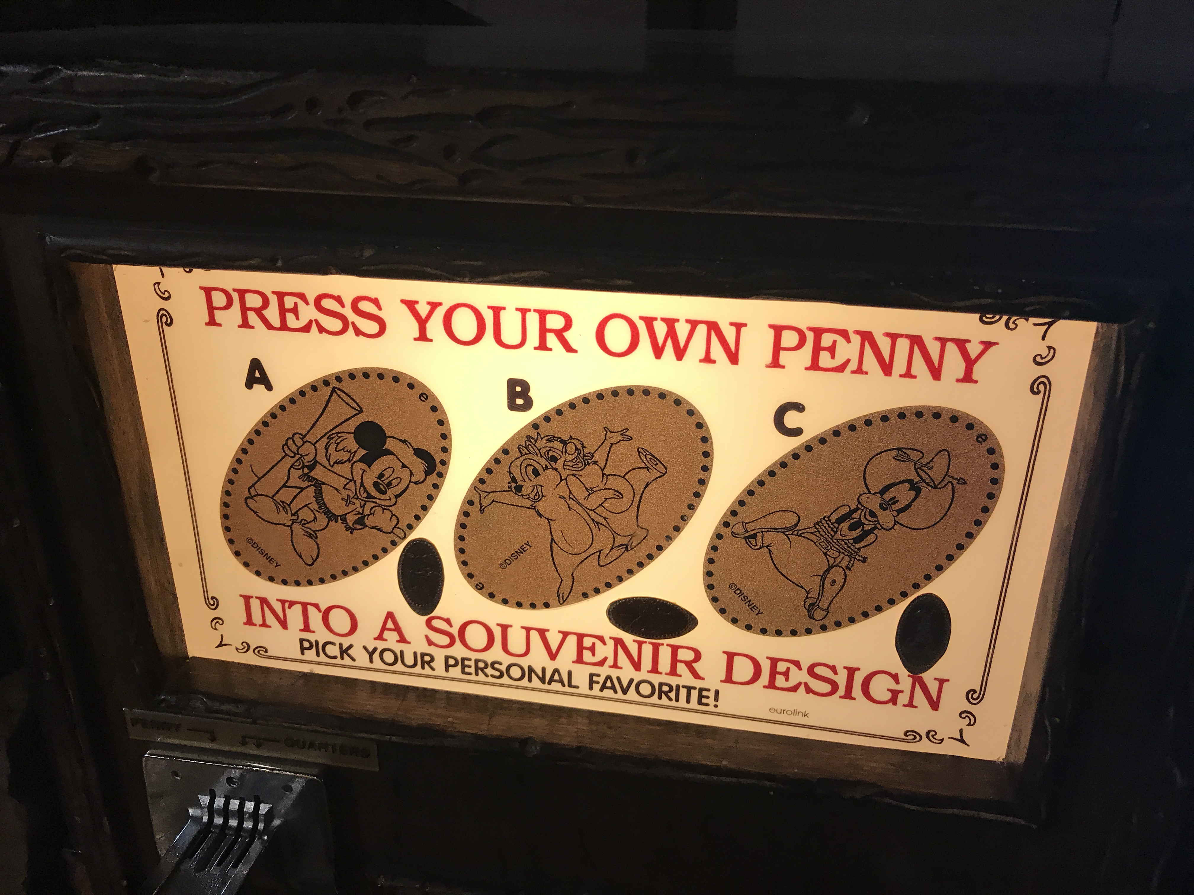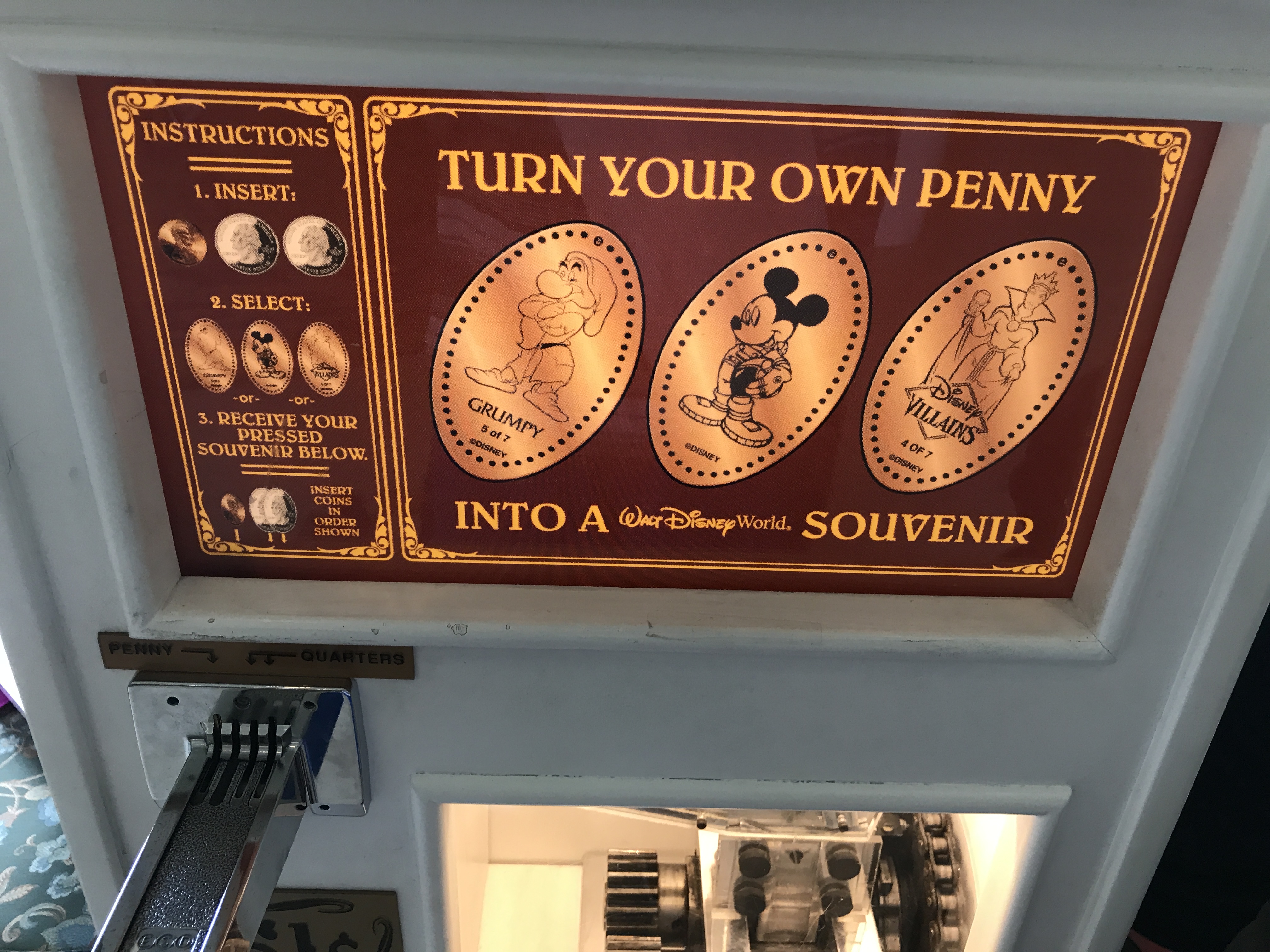 The set of pennies from this machine (when working) have designs of Grumpy Dwarf, Spaceman Mickey, and the Wicked Queen from Snow White.