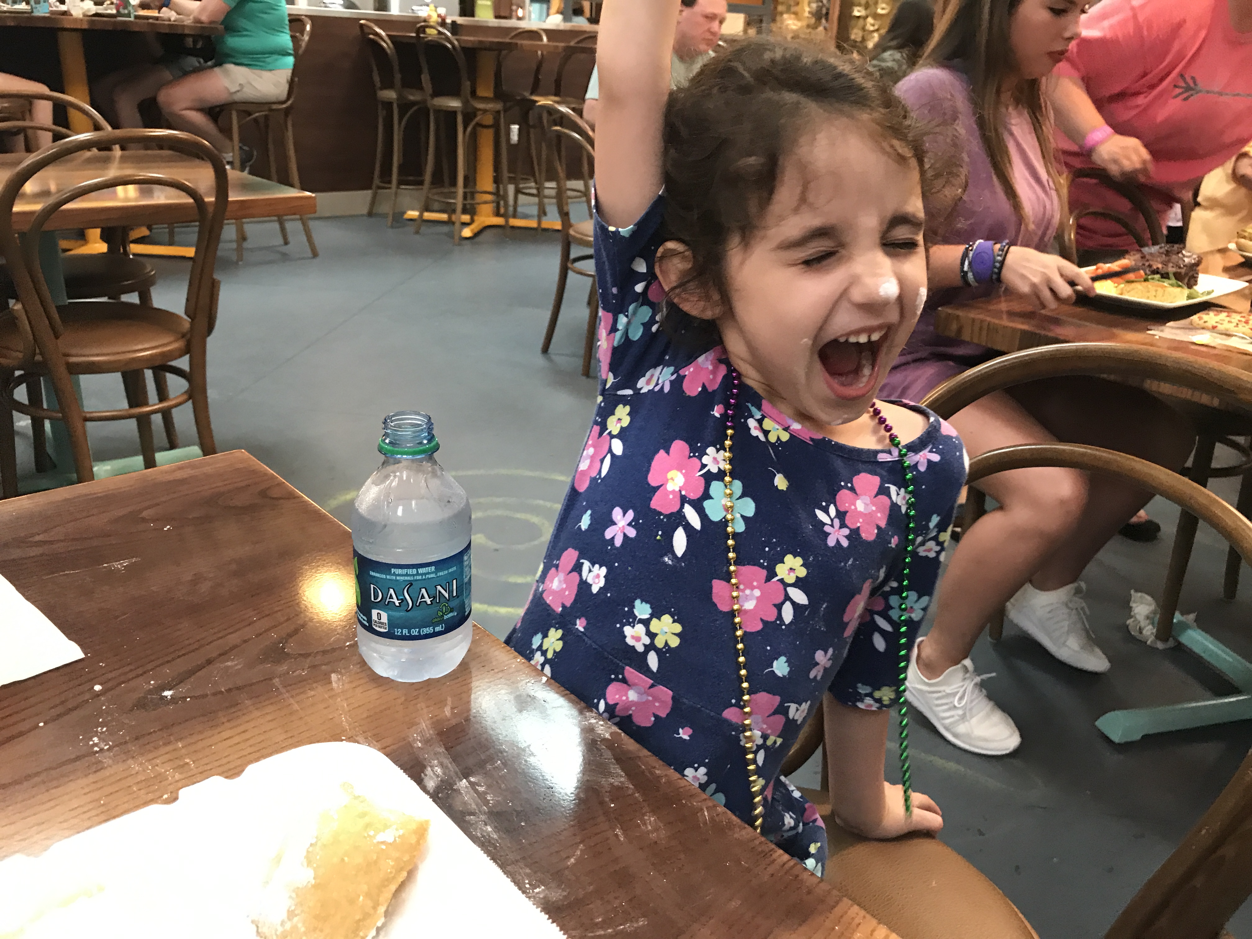 In the Sassagoula Floatworks and Food Factory is the main food court for the resort. They have items known in New Orleans like Po’ boys, Gumbo, and Jambalaya. For dessert there is my daughters favorite straight from Tiana’s Place in The Princess and the Frog, beignets. Fried squares of dough covered with powdered sugar just can’t be beat and was a nice ending to our staycation. My daughter’s reaction below explains just how we felt about those beignets. Happy collecting.
