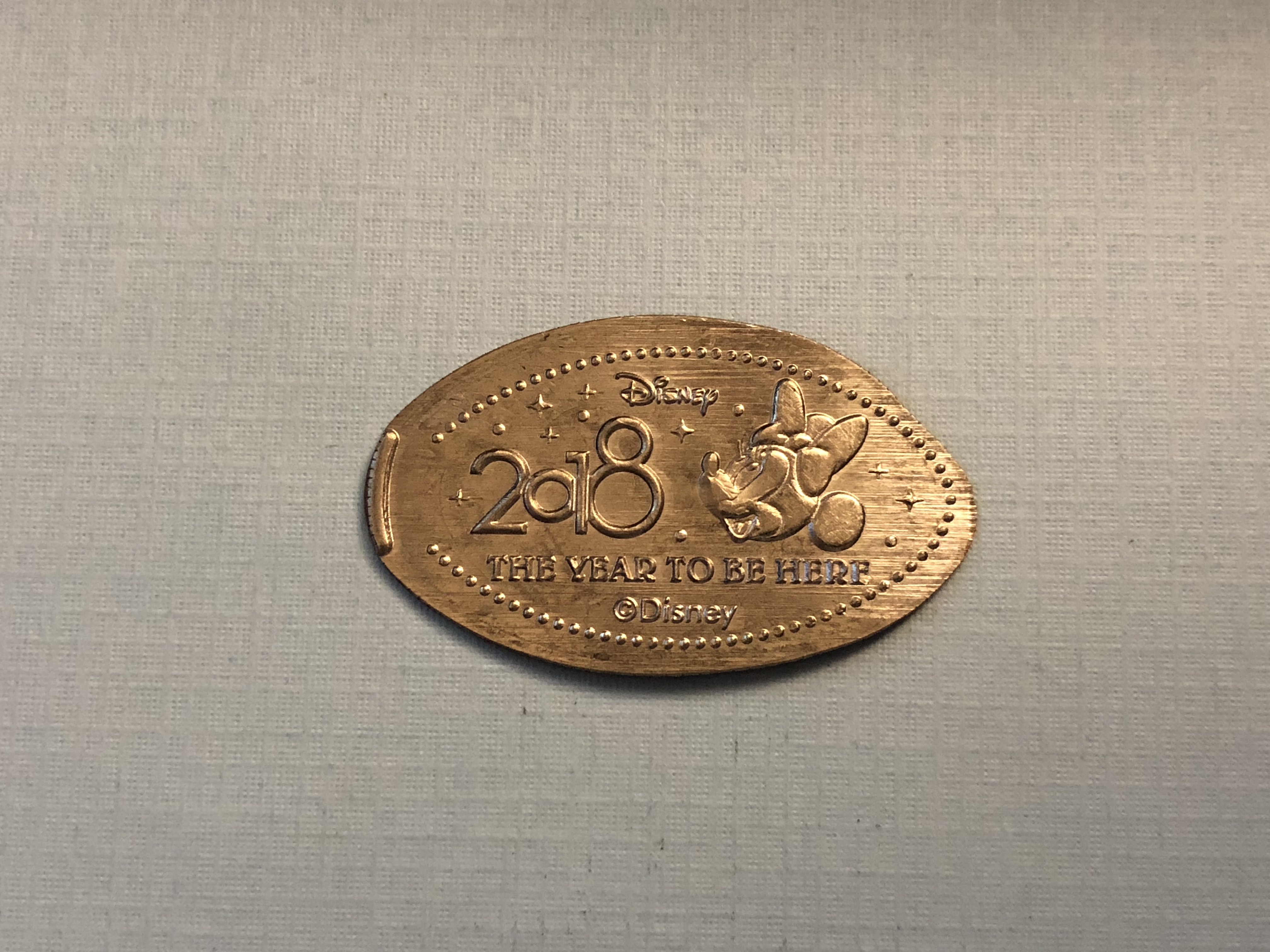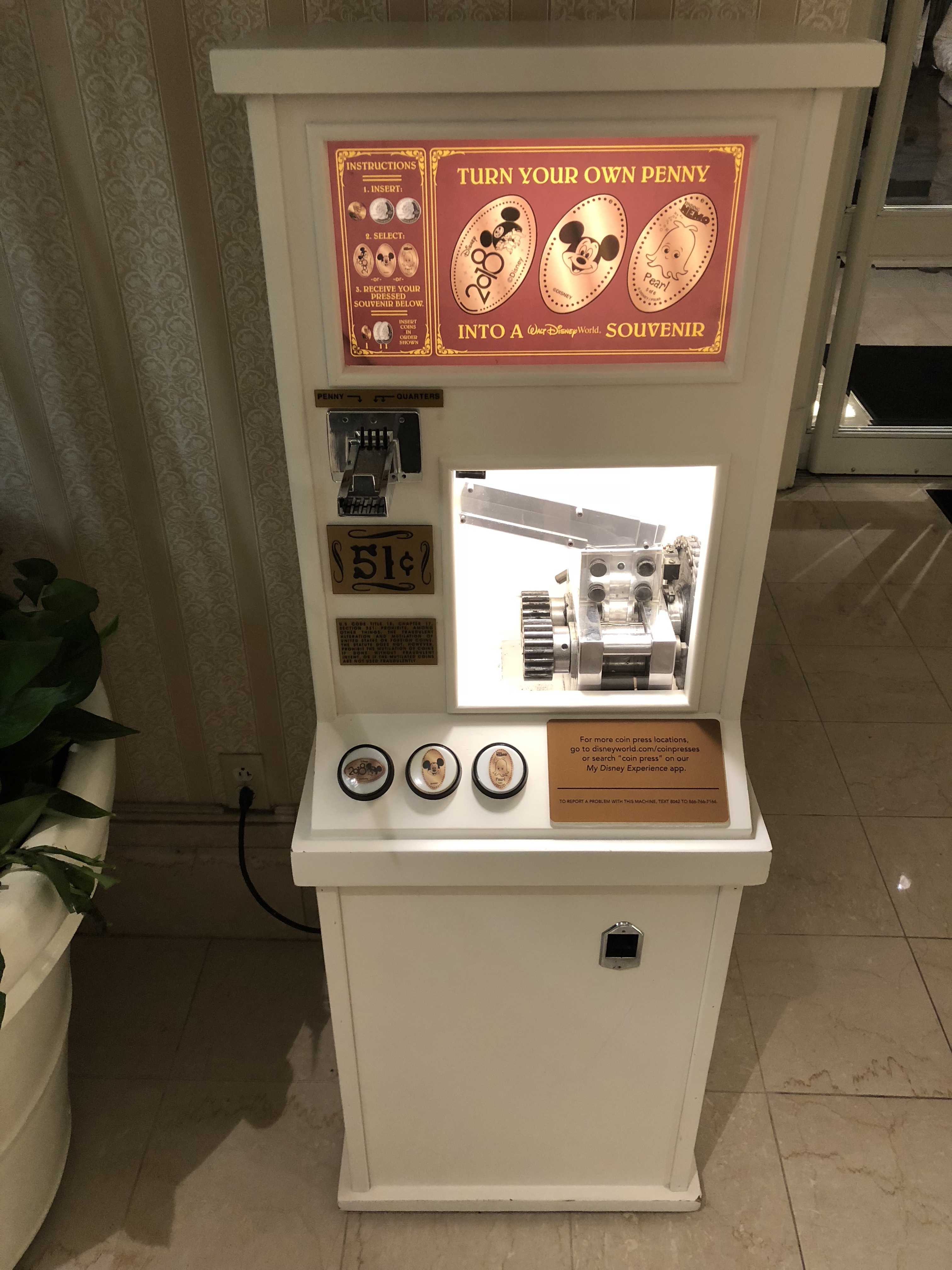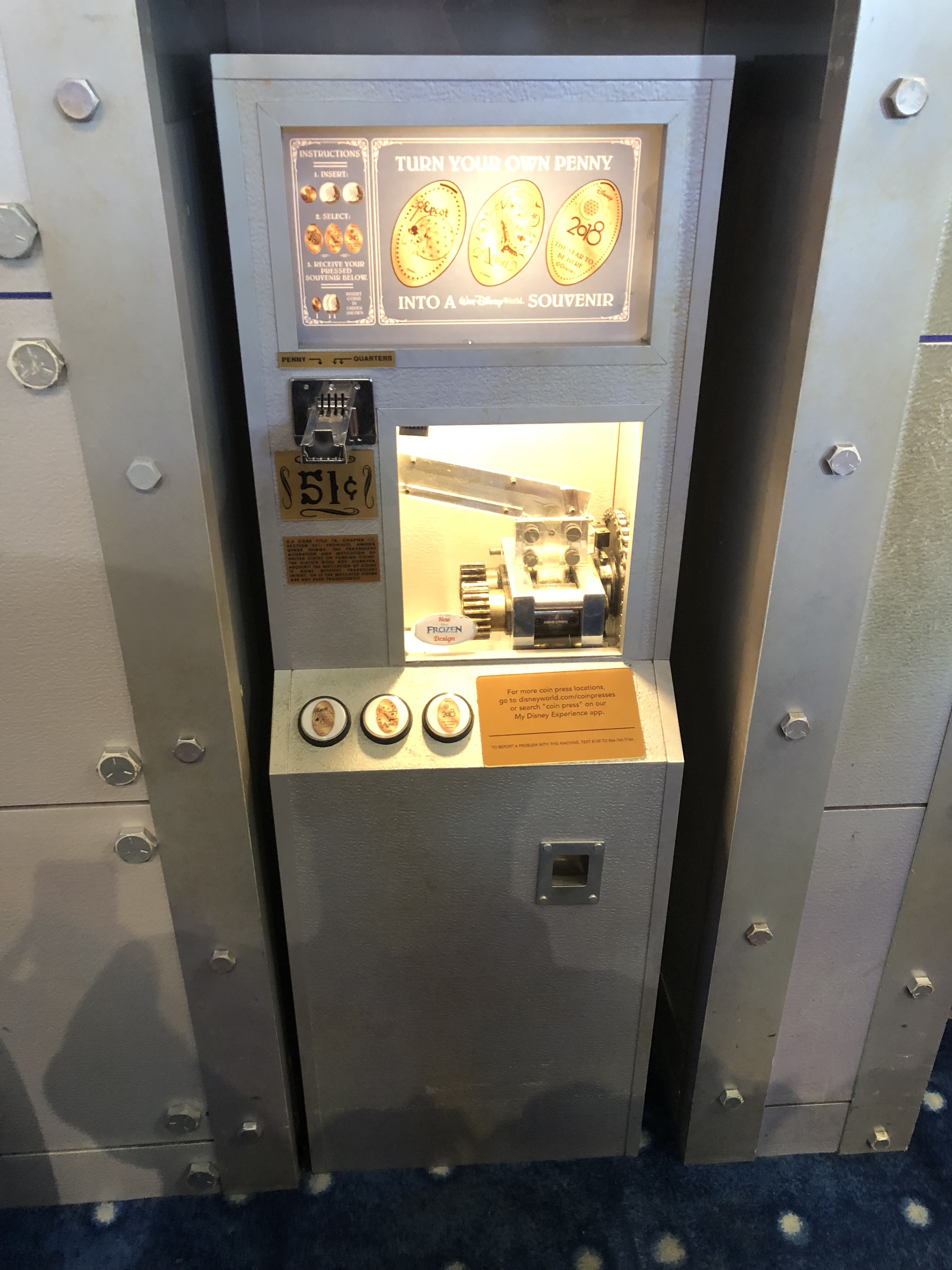 This machine had 2018 Donald Duck pressed on a quarter. Thankfully the next machine wasn’t too far away and just down the street in the All-Star Music resort.