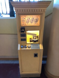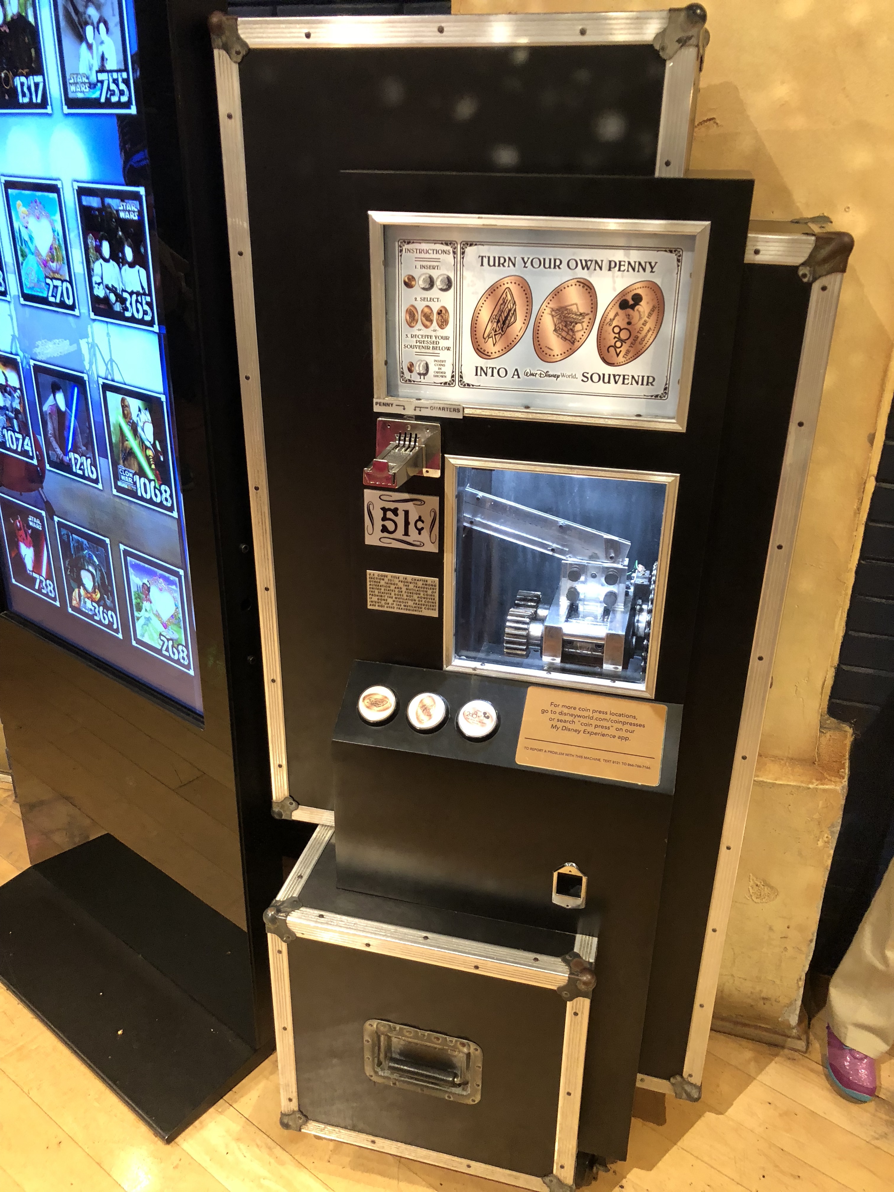 The last pressed quarter finally showed up today but it wasn’t where we were anticipating it to be. It was rumored that this coin would be available in the same location as last year which is the Stage 1 Company (Muppets) gift shop in Hollywood Studios. But due to this location being partially under construction and the machine mysteriously behind a construction wall this design was moved (temporarily?) to the All-Star Movies Resort. Right alongside the other 3 machines in the World Premier Food Court is where you can find this last design.