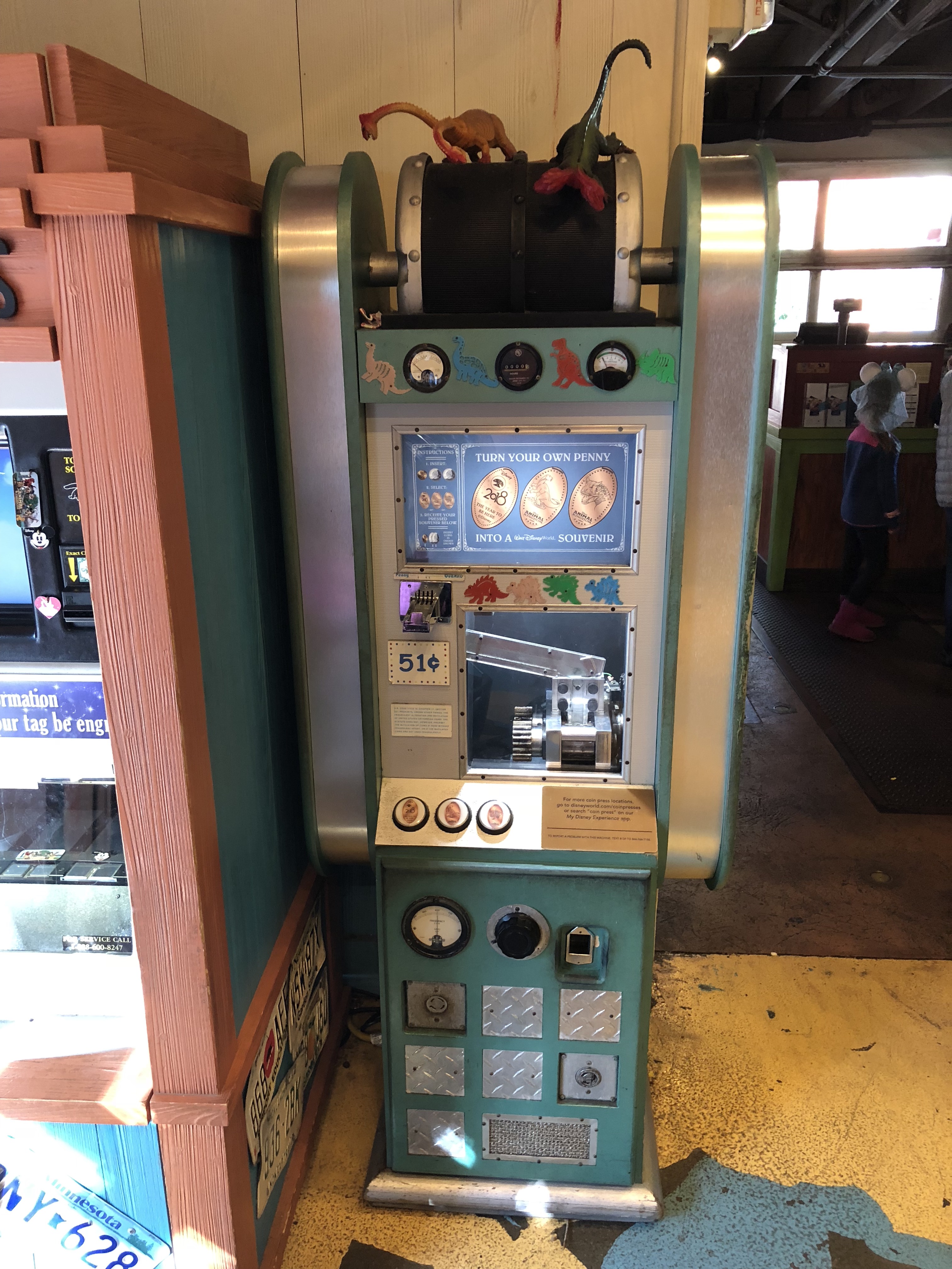 Located in Dinoland USA in a store called Chester & Hester’s Dino Treasures. The penny at this machine has 2018 with the new slogan “The Year to be Here” and a small Tree of Life.