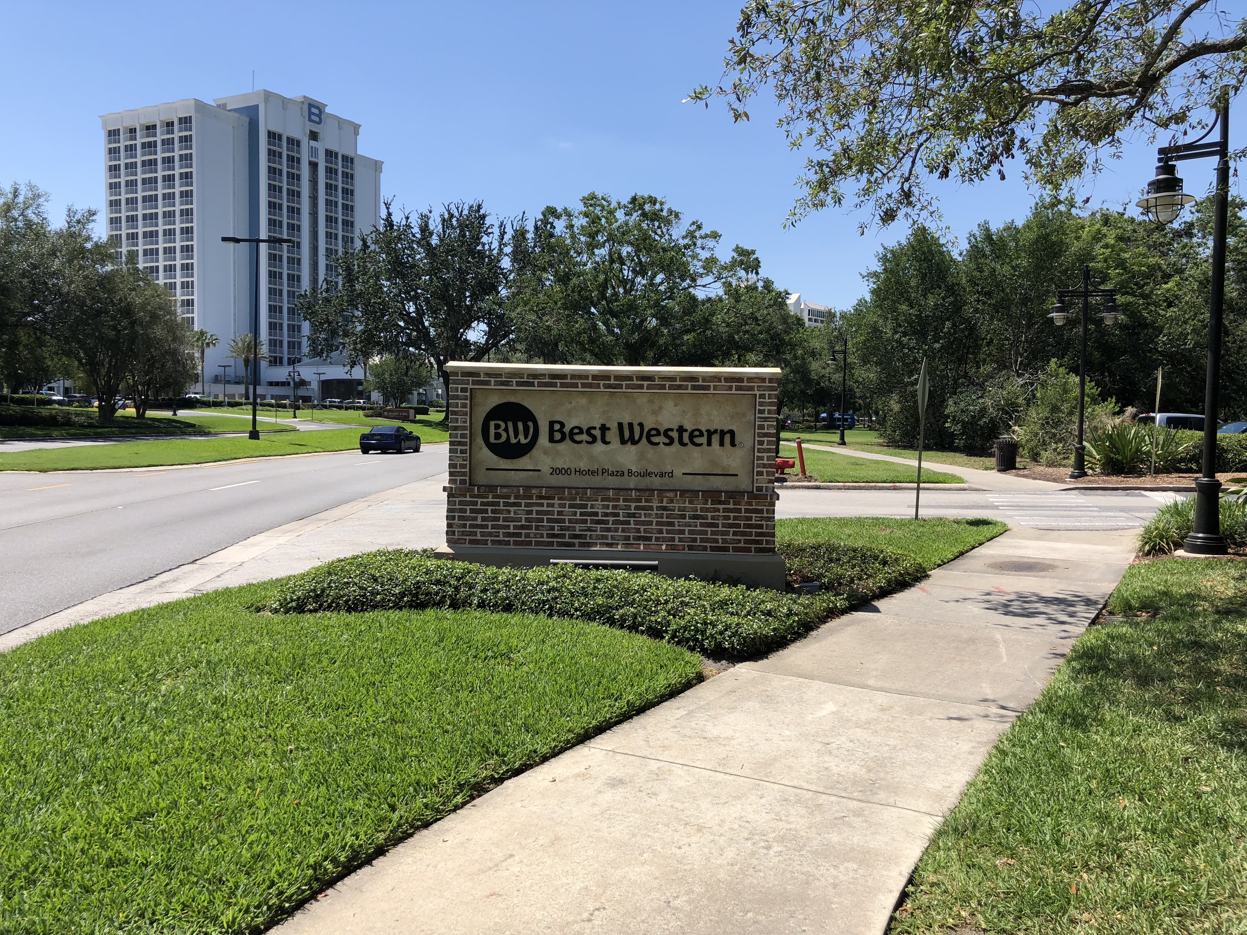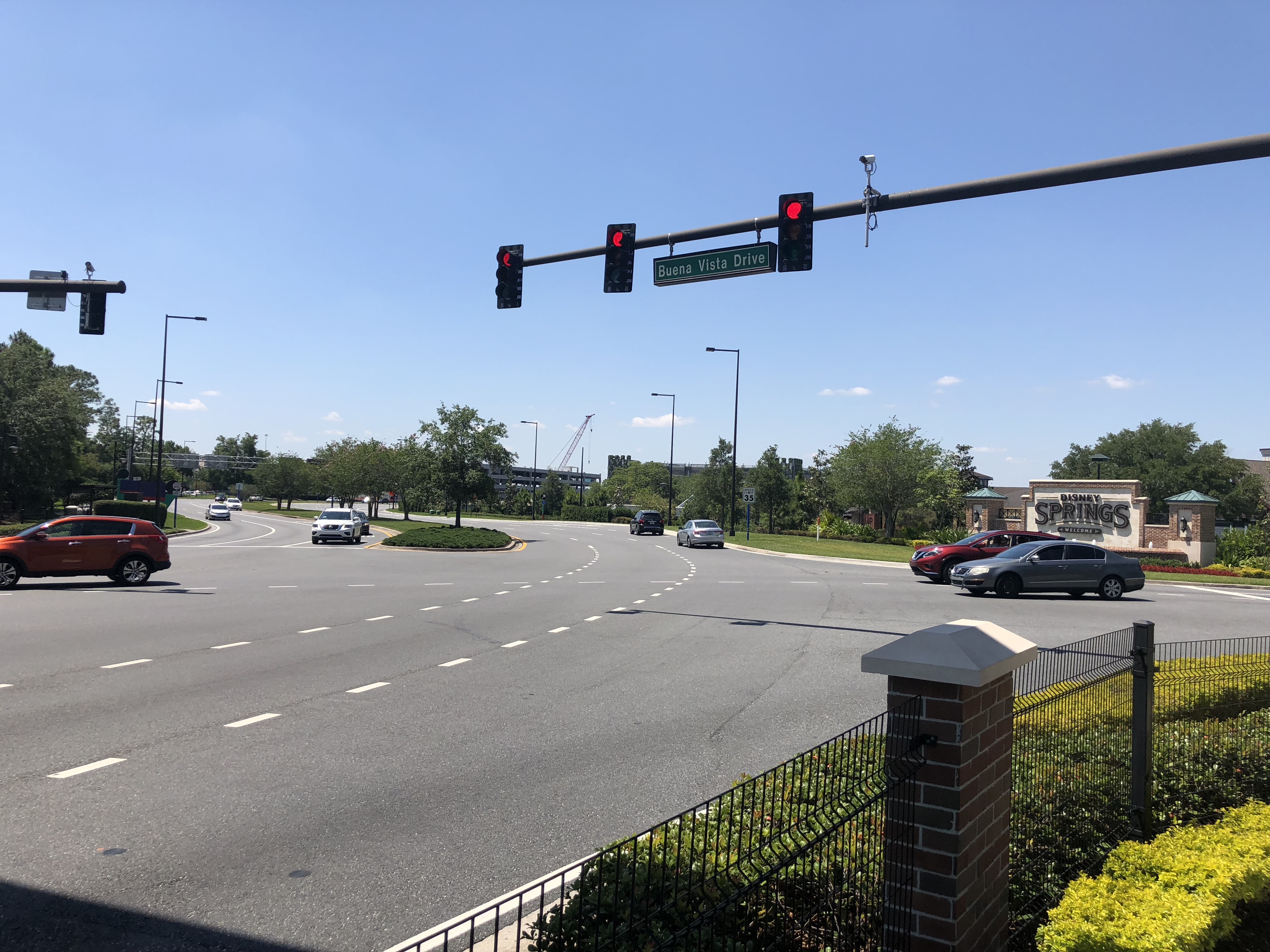 At this intersection of Hotel Plaza Boulevard and East Buena Vista Drive is where the overhead walkways where that we had initially taken to cross the street. On this side of the boulevard there was a sidewalk so we just headed to the right down East Buena Vista Drive.