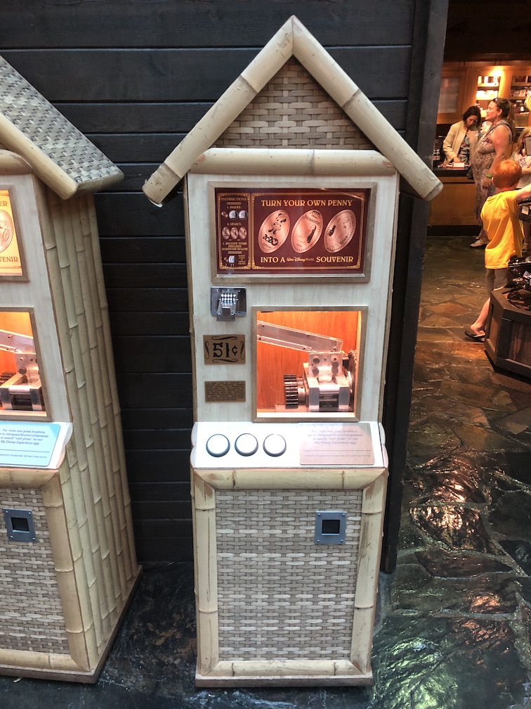 I love the theming at the Polynesian Village Resort, and the food options are great. Inside the main lobby building called the Grand Ceremonial House, up on the second floor is the Moana Mercantile and the penny machine is right outside the store.