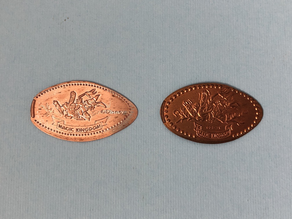 First, we will look at the Br’er Vulture design. It was originally at this very same location under the Frontierland Railroad Station. However, when I put the two pennies together (New is on the Left, and Old is on the Right) you can see there are some differences. There is now a notch at the top of the design that splits the dot border, and the Magic Kingdom banner is in a different location.