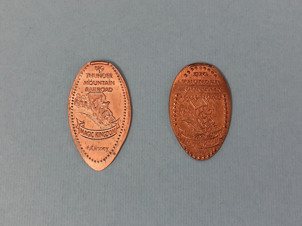 The last penny design used to be inside the Country Bear Jamboree waiting area but was recently removed and replaced with an 8-design touch screen machine. That notch is again splitting the border, Big Thunder Mountain Railroad appears to be a new font, the Train and tracks look a bit more detailed, and the Magic Kingdom banner has been raised a bit and isn’t as wide.