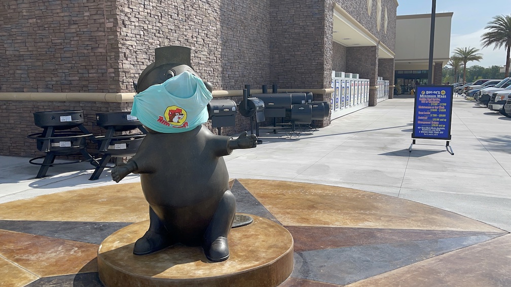 The first thing I noticed when getting off the interstate and into the parking lot were the signed that advertised Big Rig Trucks were not allowed at their location. This seemed strange, but after some further research apparently this is something they have implemented at all their locations. Also they have an incredible number of Gas Pumps to fill up your vehicle. I believe this location along had over 100 pumps. After I parked my car and headed towards the entrance I was met by their Mascot Bucky keeping safe and wearing his facial covering.