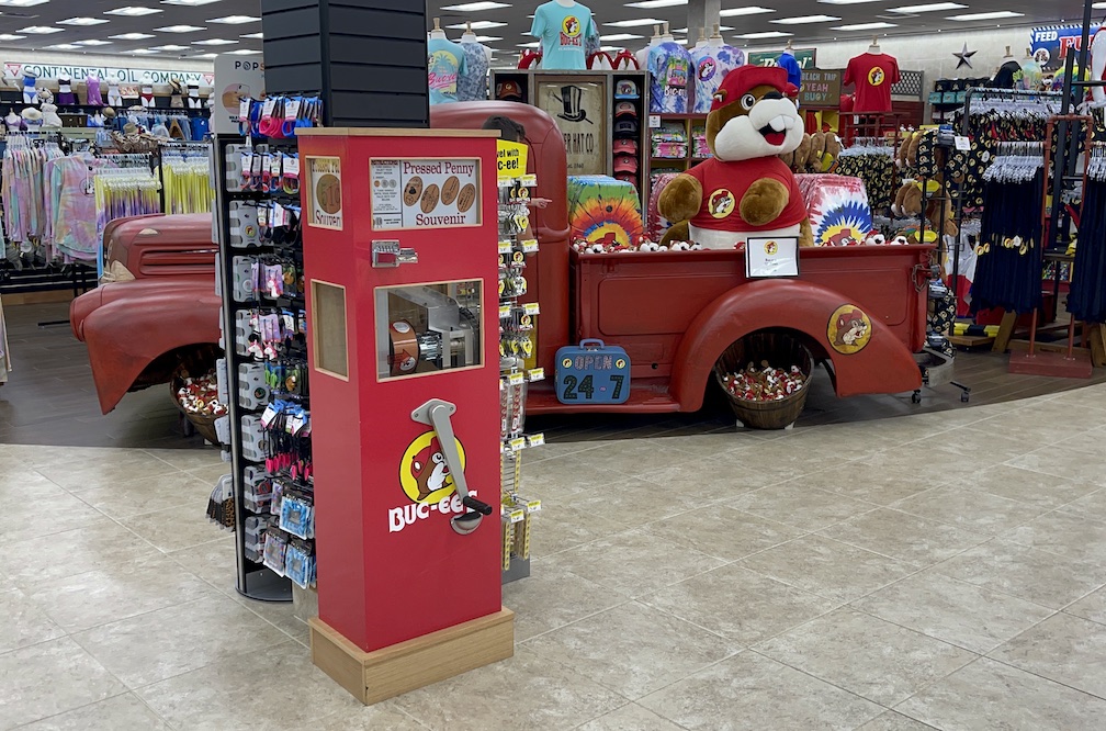 With my basket full of food I was about to check out and go indulge in my car, but then remembered there was a pressed penny machine inside that I had completely overlooked. Thankfully it wasn’t too far away, just look for the old Bucky pickup truck near the merchandise section.