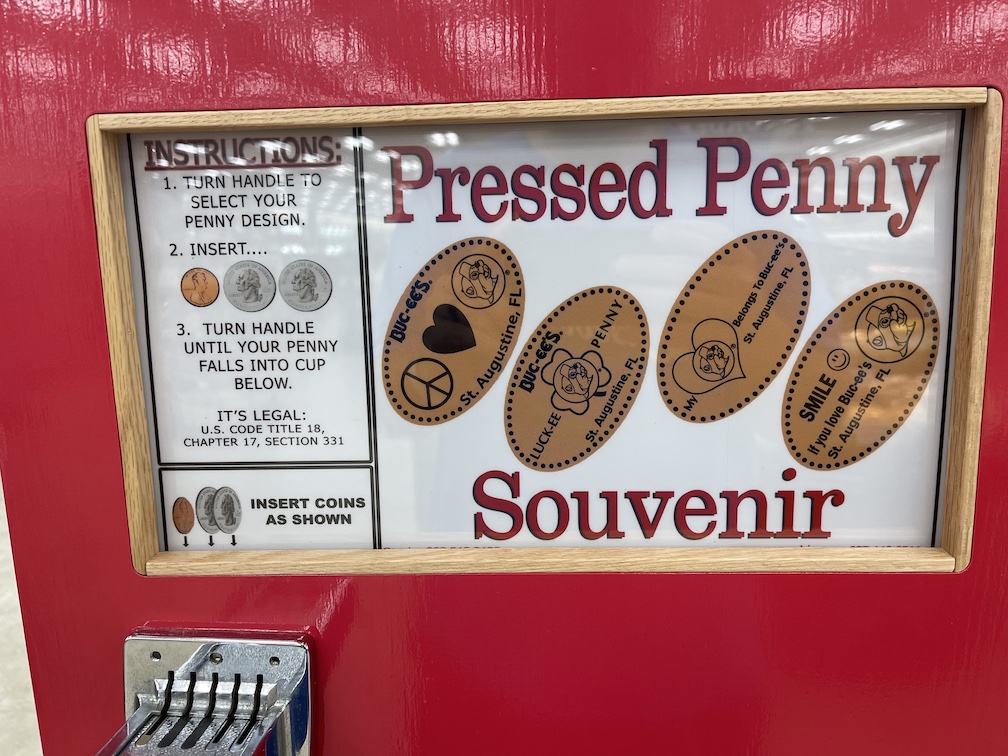 The designed available in this machine were all created specifically for this location and stated St. Augustine, FL on each of them. The first has an image of Peace Heart Buc-ee’s, the second was a Luck-ee Penny, the third said Belongs to Buc-ee’s, and the last said Smile if you love Buc-ee’s. These designs were really cute and I do really like that they had the location listed on each coin. This makes for a fun little sub-set to collect along your travels.