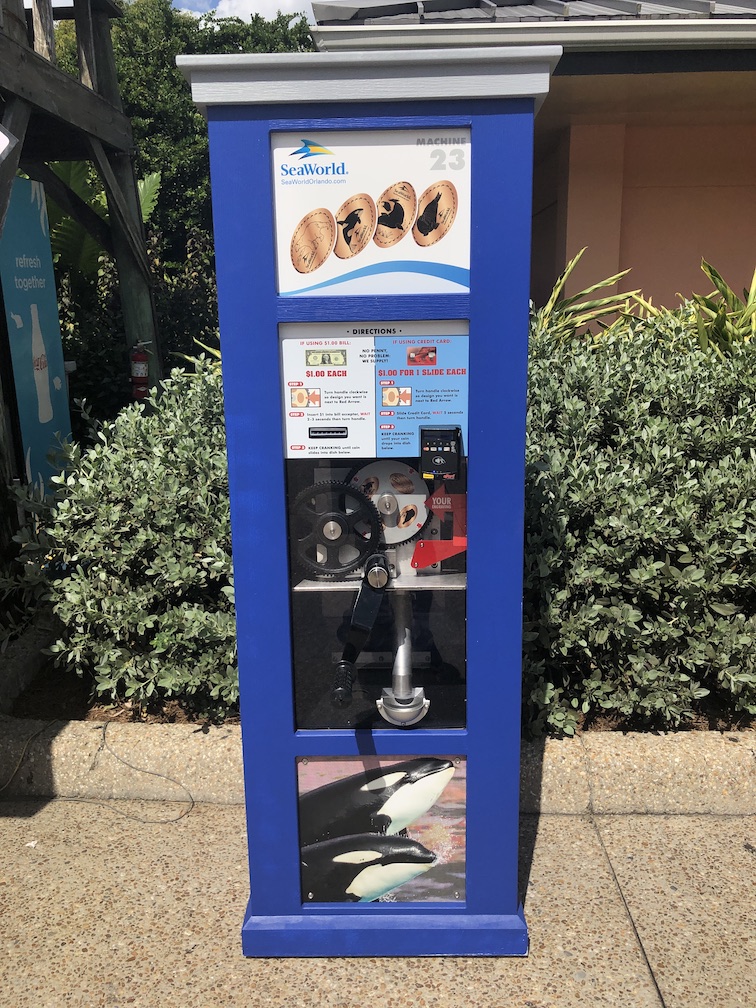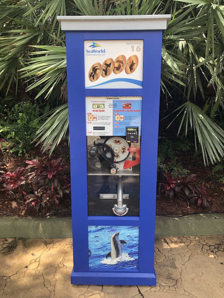 As with so many of the other theme parks around Central Florida, SeaWorld’s pressed penny machines have now been completely changed over to $1 per design. The machine does supply the penny for you, and initially I found them to be all nice new shiny zinc coins. However over time it seems that the machines are being loaded with circulated pennies that may be more tarnished or dirty making for a not so great final pressing. With that said most can be easily cleaned back at your home.