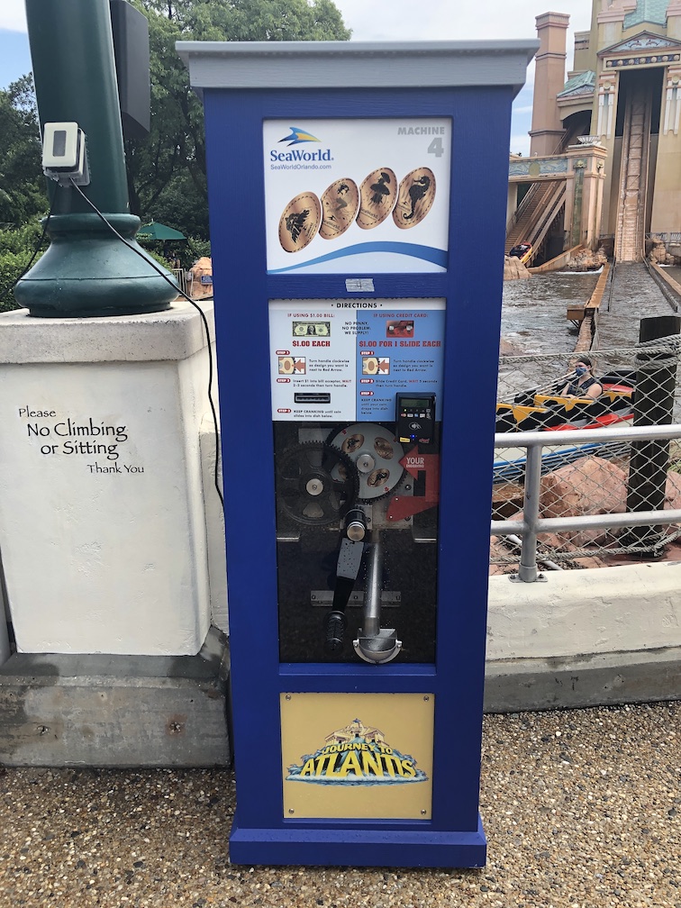 Near the Journey to Atlantis water flume ride is where the next machine was found. Now usually the water splash from the ride won’t make it this far over the wall and I’m sure they don’t want to damage the machine by having it constantly soaked with water. But with that all said, I would still be on the lookout just in case. You never know when a rogue wave may hit.
