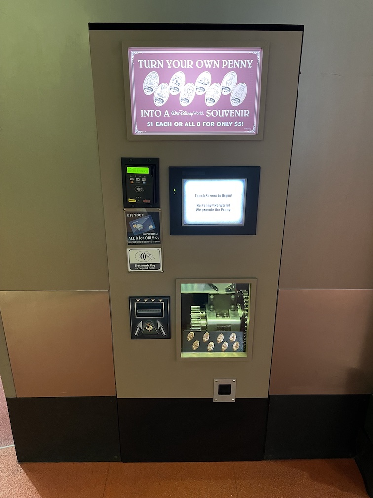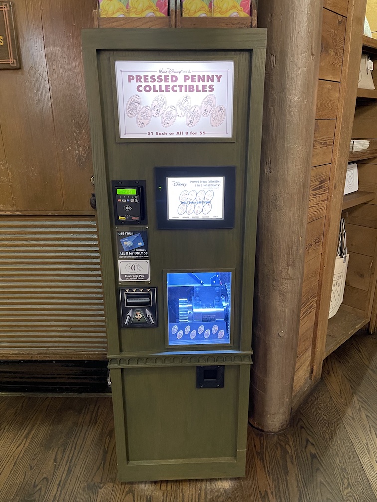 Right off the bat we can see that the previous 3-design machine is no more. I did take a tour around the entire store and confirmed with a cast member that it has been completely removed and those designs we are going to consider now retired. In it’s place is this new 8-design machine that is quickly becoming the norm all over WDW property. The cabinet is a simple wood finish, it does fit pretty well with this store although it would have been perfect if it looks more like a wood cabin but that’s being pretty picky at this point.