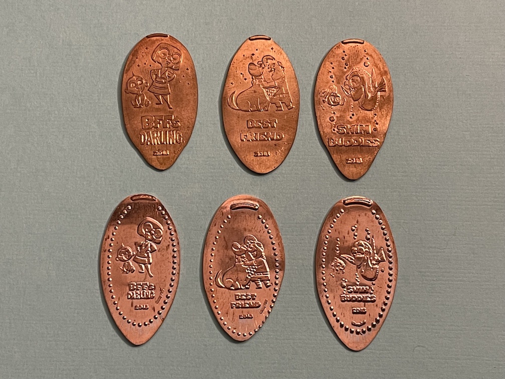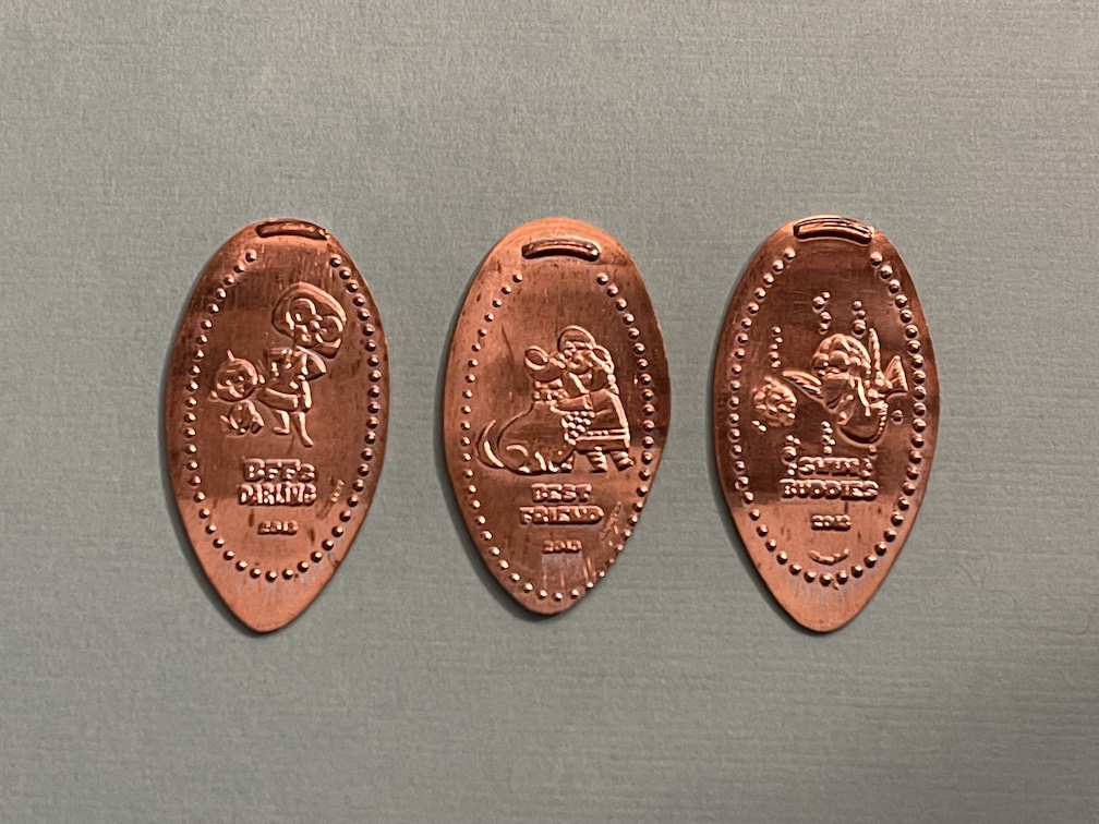 Above I put together a comparison so you can see them more clearly. The top row are the original released versions. They were pressed on copper pennies. The bottom set is from the newly returned machine which has been updated with the newer style payment system we have been finding everyone, plus the machine now supplies the penny to be pressed. The set I received do appear to be pressed on some shiny zinc pennies. Some obvious differences is the size of the actual characters has been reduced, the new set now has a dotted boarder and even the BFF Forever text is much smaller.