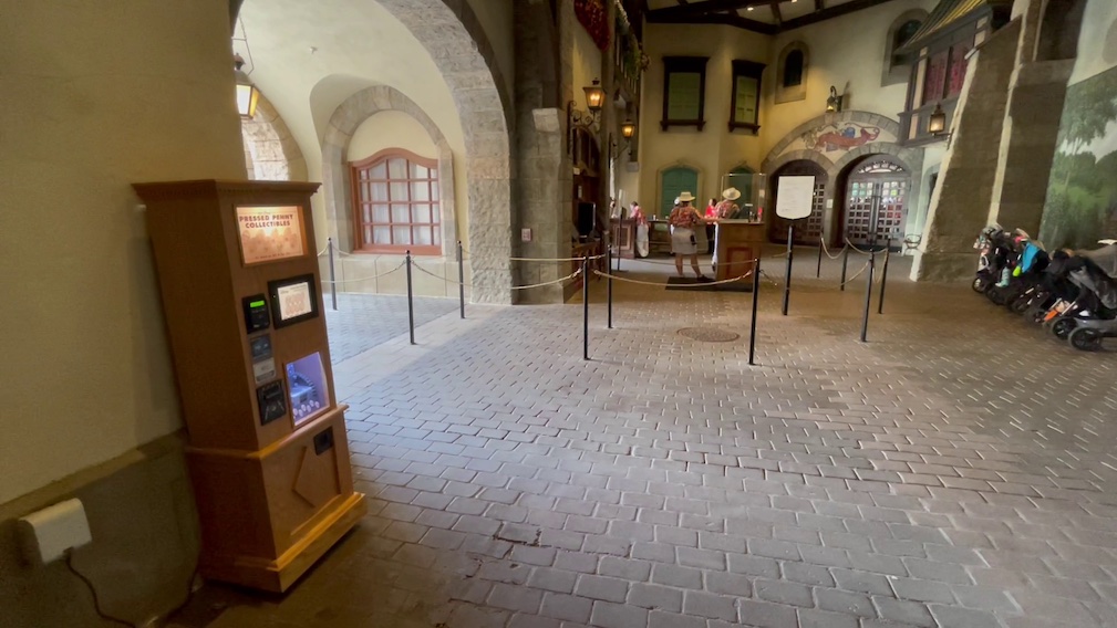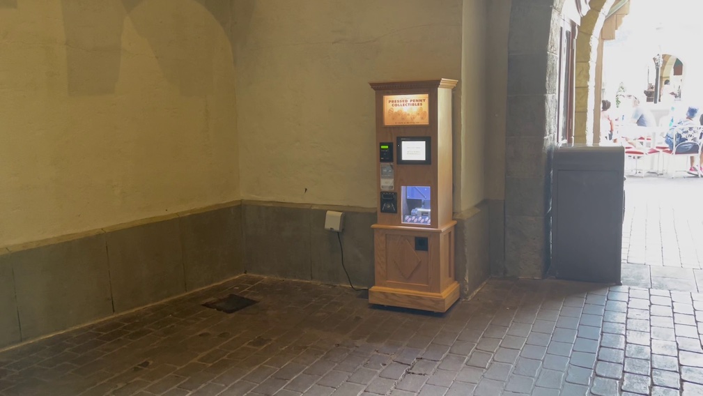 After our Remy preview (which was amazing by the way, definitely check out that attraction after it opens official October 1st, 2021), we took a nice walk around the World Showcase Lagoon to the Germany Pavilion. This machine is a bit hard to find, as it’s tucked away in the back corner of the pavilion. The easiest way I can describe the location is if you find the Biergarten restaurant entrance it’s directly across from that.