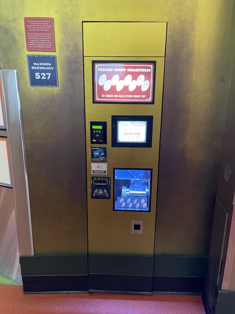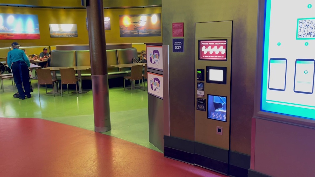 This machine is found in the World Premier Food Court and has replaced the pressed quarter machine that used to be here. The cabinet matches the pressed penny machines which I think is a nice touch. The medallion designs here are of the Mad Hatter, Joe Gardner, Frozone and Edna Mode.