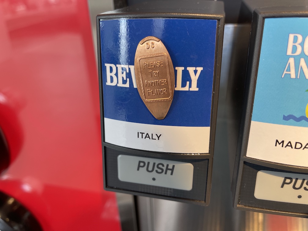 As I’m sure you can guess this place is pretty popular and gets very busy from time to time. With all the soda you can drink it’s a fun way to cool off from the Florida sun. There is a one draw back that can happen from time to time and that is you may come across a sticker placed on one or more of the soda nozzles that says “Please Try Another Flavor”. As with so many things in Disney this sticker has become an icon among funs and due to its association with Beverly I’ve seen it on stickers, t-shirts, button and now a pressed penny.