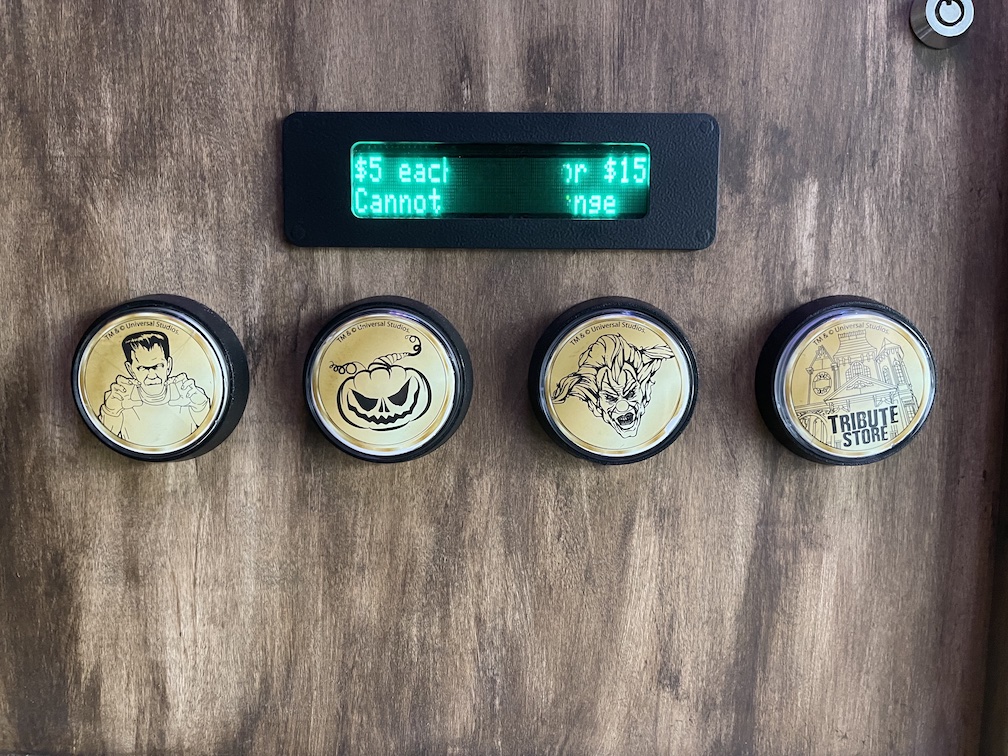 After picked up my new t-shirt I was heading out of the store but stopped in my tracks as I was confronted by an amazing sight, a brand new collectible medallion machine with Horror Nights coins.