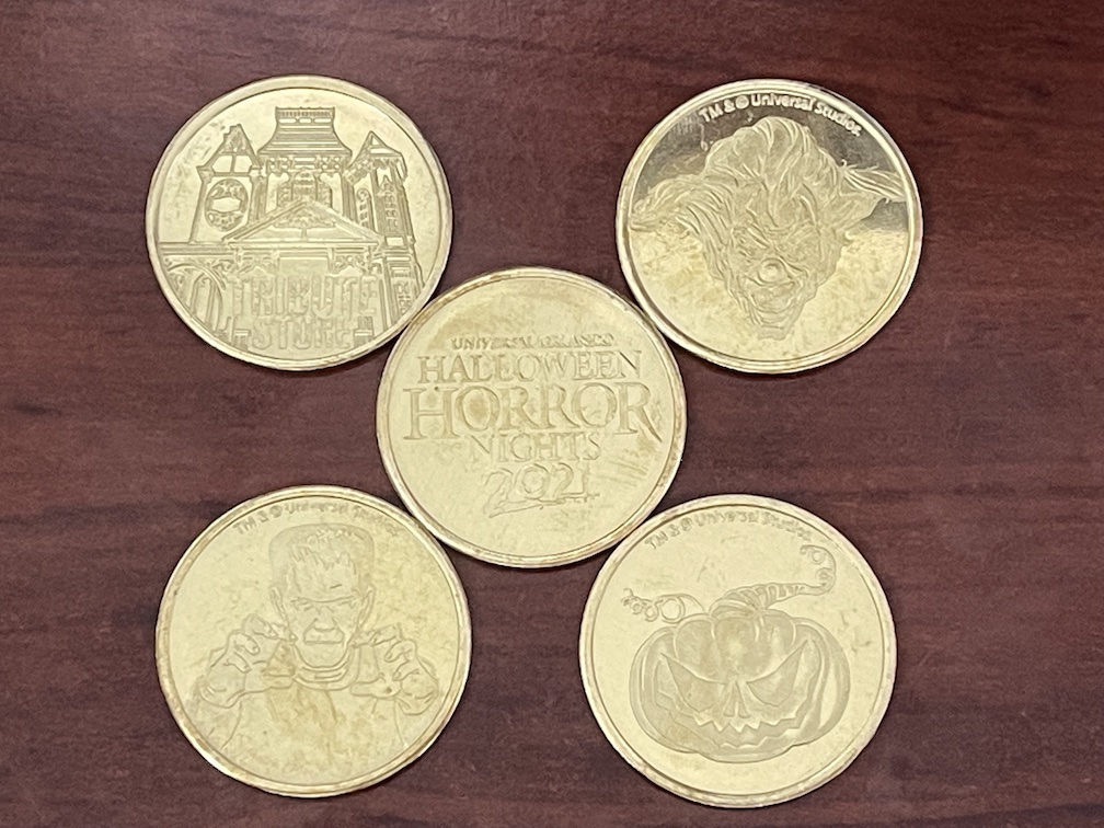 The designs available included the Tribute Store facade, Jack the Clown, Frankenstein’s Monster, and a spooky Jack-o-lantern. The reverse side of each medallion had the Halloween Horror Nights 2021 logo.