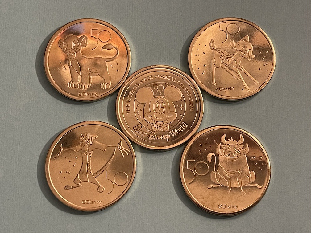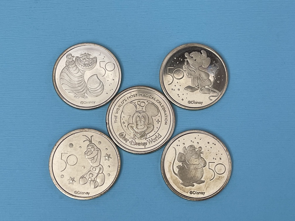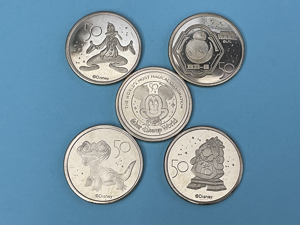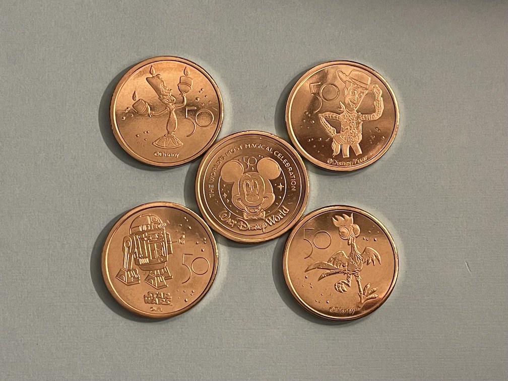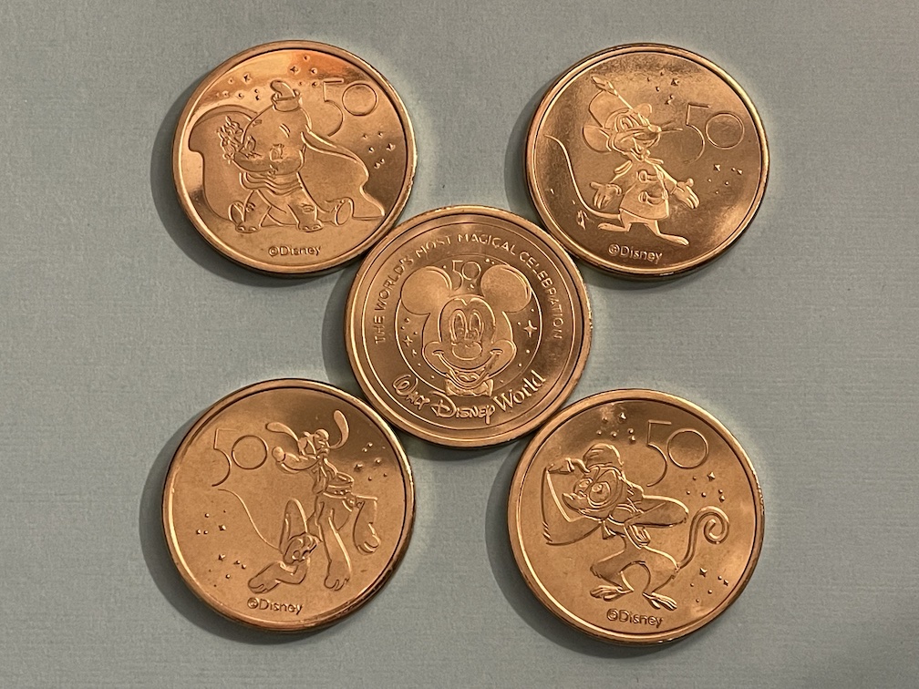 This set has designs of Mickey Mouse, Minnie Mouse, Lady and Tinker Bell. The reverse of each coin has a smiling Mickey face, and says The World’s Most Magical Celebration 50 Walt Disney World.