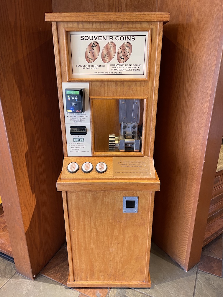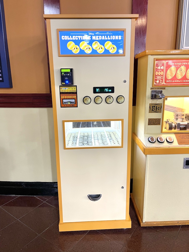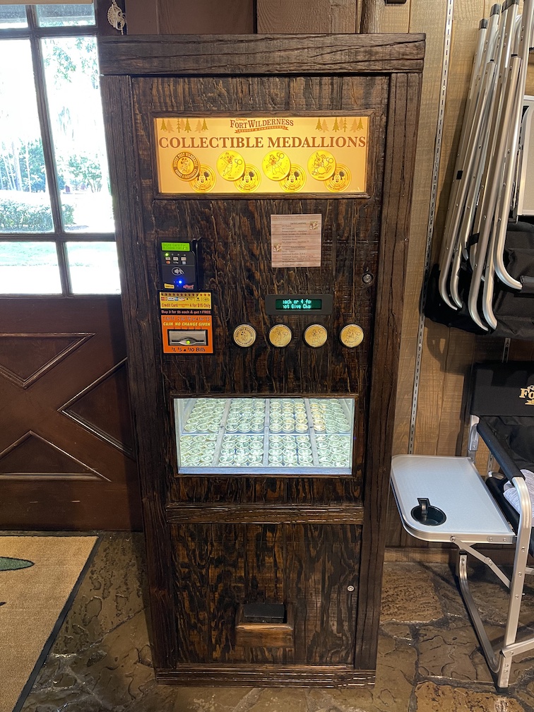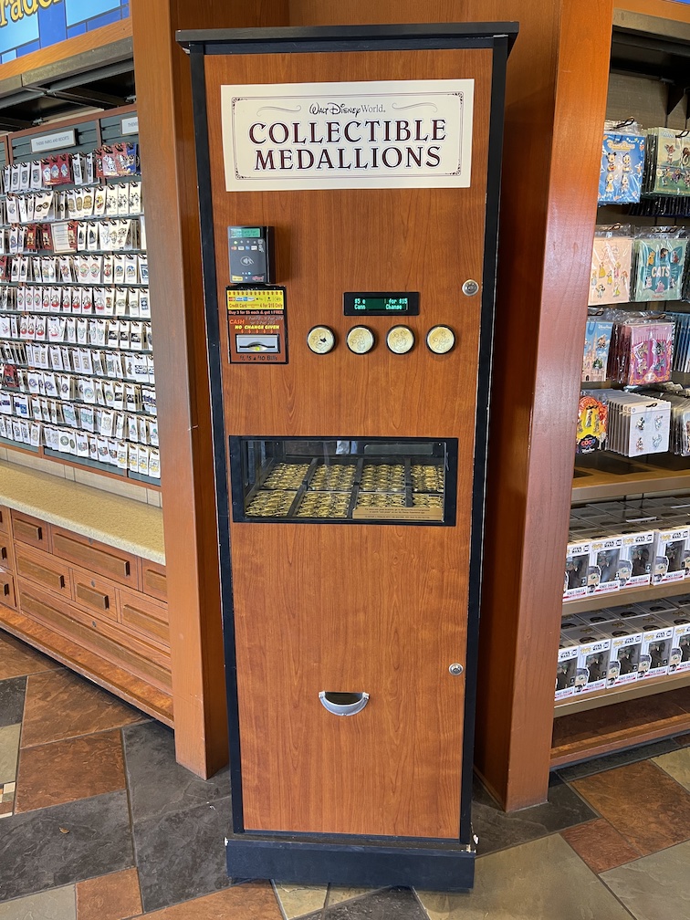 The machine is located just inside the main set of doors to this store. The credit card option was not working when I visited, but it was accepting cash with no issue. The medallion designs available here include one special Fort Wilderness Resort with hiking Mickey, Thumper, Chip and Dale.