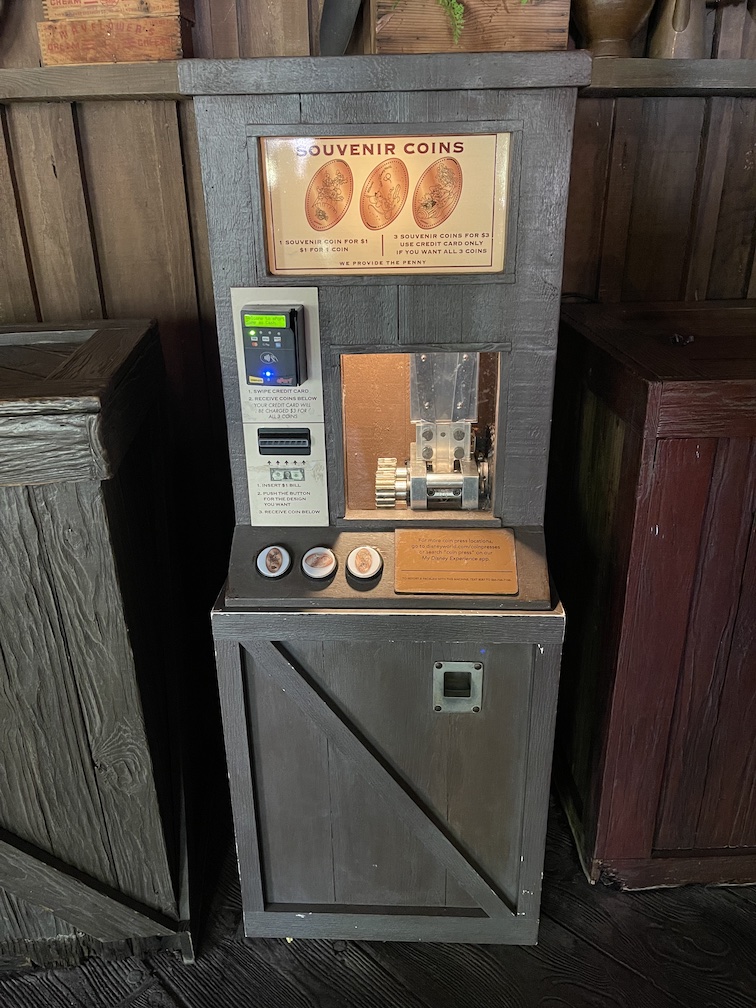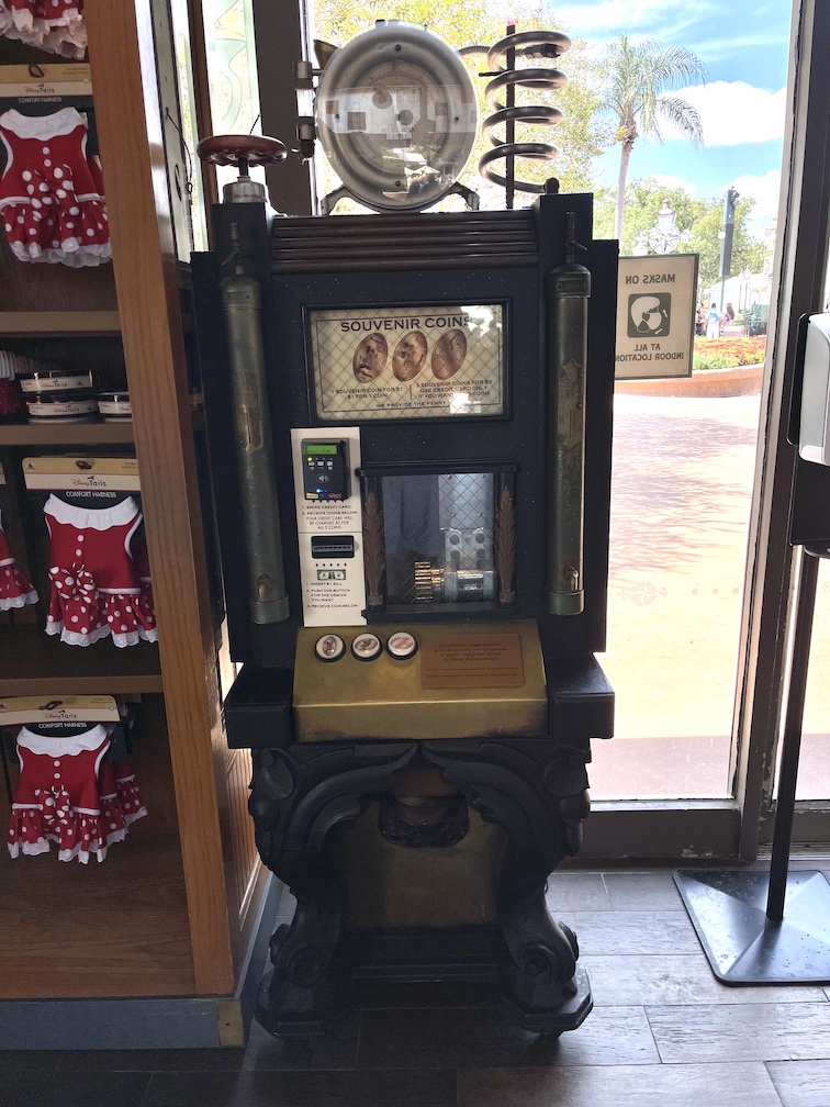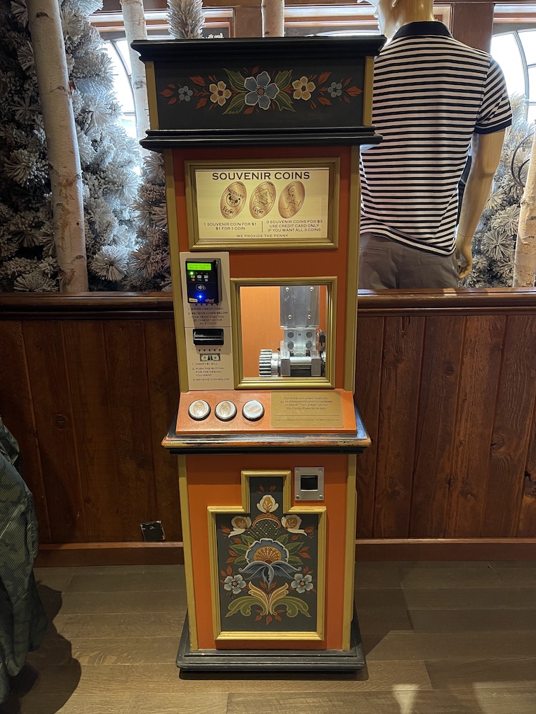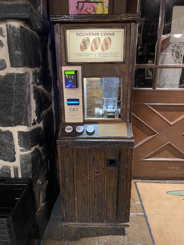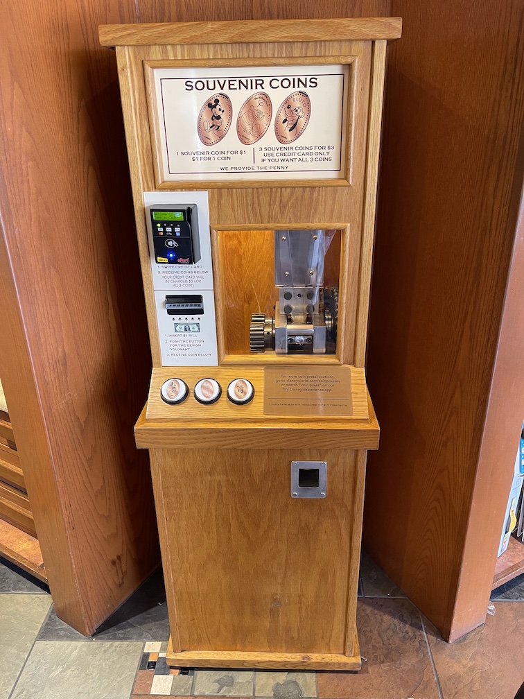 The machine is located just inside the main set of doors to this store. The credit card option was not working when I visited, but it was accepting cash with no issue. The medallion designs available here include one special Fort Wilderness Resort with hiking Mickey, Thumper, Chip and Dale.