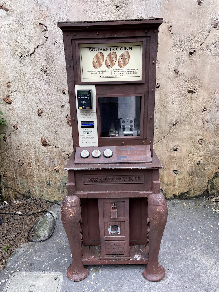 Leaving Dinoland behind we now had a bit of a walk through the Asian and then into the African section of the park. Back near the Kilamanjaro Safari is a cart/tent called Curiosity Tourism and just behind that is the penny machine we were looking for. The new design here has the world famous meerkat Timon from The Lion King.