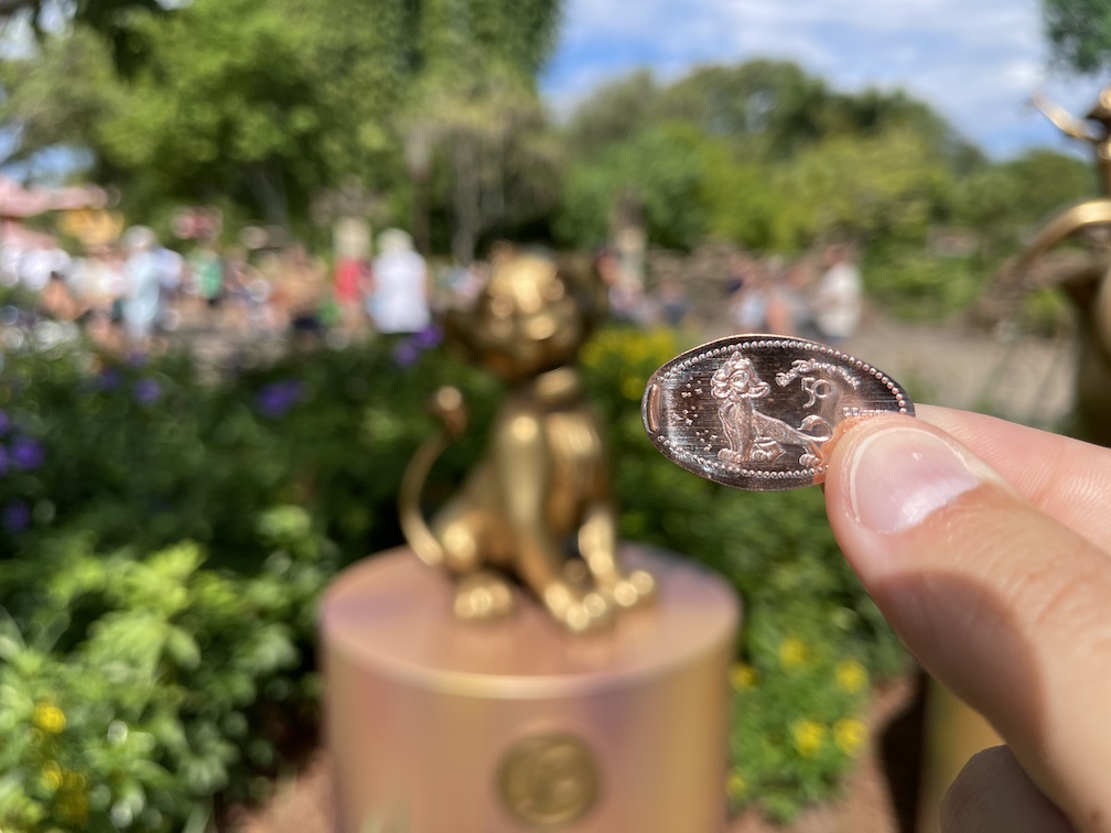 **UPDATED 04/22/2022** Originally this design and machine were located outside the Dawa Bar in Harambe. But just recently that machine was removed, and the design dies were placed into a different machine up at the front of the park just past the touchpoint where you tap your MagicBand or ticket to enter the park. Nearby on the right side you will find the Garden Gate Gifts which is also where you can rent strollers and the machine is kind of tucked away in the corner near a Cast Member only building/door. This is where you can press the Pumbaa 50th penny.