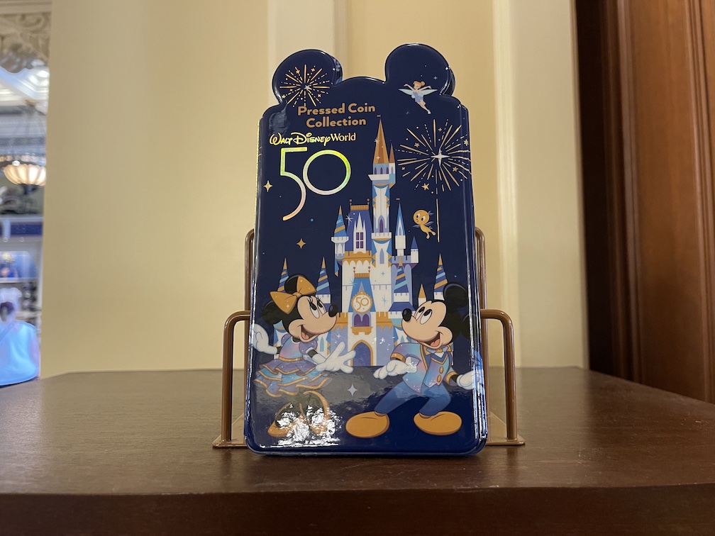 This set includes some fun new designs of Mickey Mouse, Minnie Mouse, Gus from Cinderella, and Olaf from Frozen. Each design also includes a “50” overtop of each character. With these pennies stately stored away, I headed down towards Cinderella Castle we took a quick detour into the Main Street Emporium.