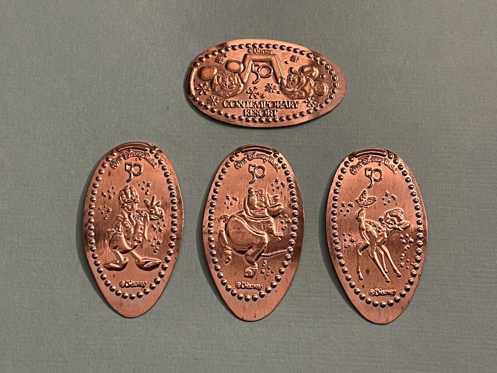 I spent always a whole day using different modes of Disney Transportation checking out all the different resorts looking for more new pennies with not much success. But eventually after checking at the Magic Kingdom which you already read about above, I took a quick stop into the Contemporary Resort and found some new machines. This used to be home to the more glorious wall of pressed coin machines with a total of 6 all in one place. Now however those are all gone and in their place are two new 8-design machines. I’ll be reviewing the other non-50th designs in an upcoming post but for this article I wanted to just show off the 50th designs of Donald, Gus, Bambi and a great one of the Contemporary Resort. For those eagled eyed readers you may notice a new medallion machine just to the left in the above picture and you would be spot on. It contains 50th Medallions designs, and I’ve heard rumors that there may be a total of 50 medallions coming out as well so I’m going to be creating a separate post to track the medallions which you can check out here.