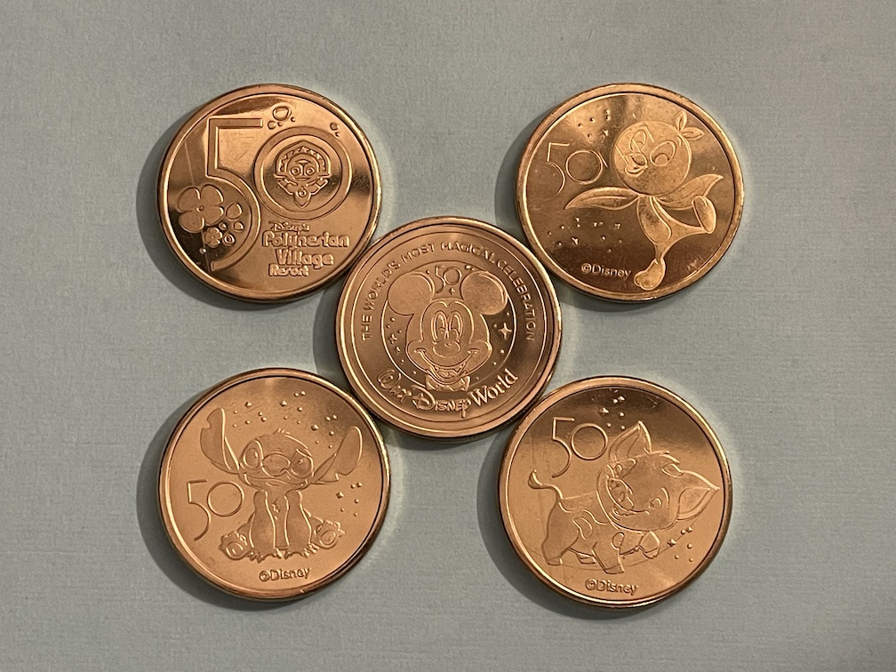 Adding to this ever growing set of 50th Anniversary Medallions we found designs celebrating the Polynesian Village Resort, the Orange Bird, Stitch and Pua from Moana. The reverse image is the same as all the other medallions we have found so far.