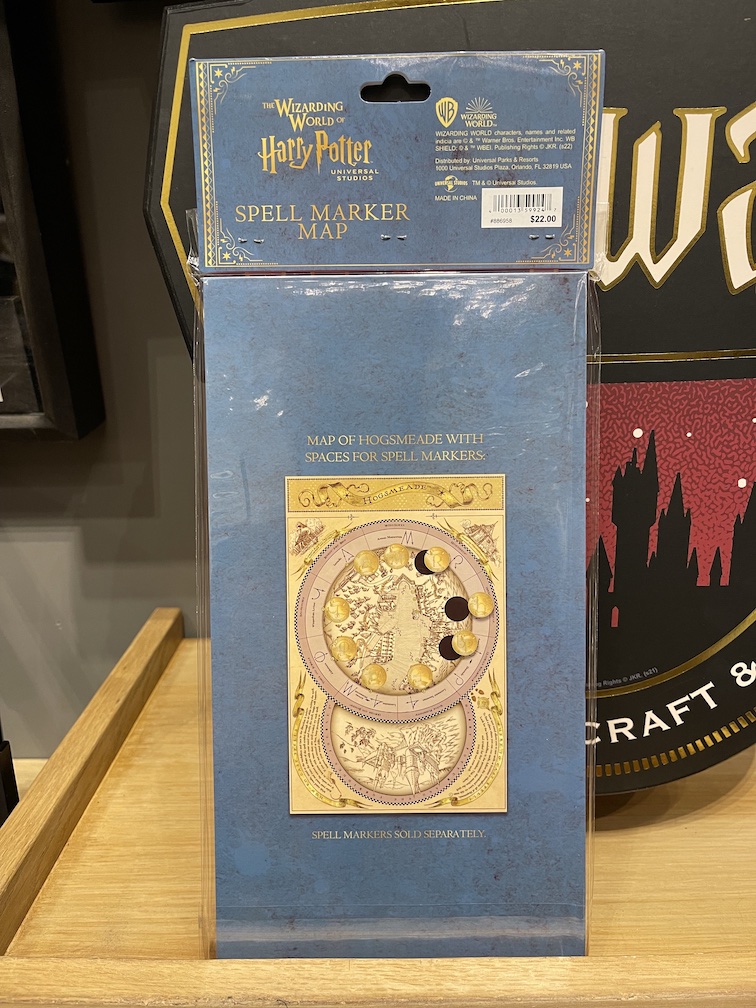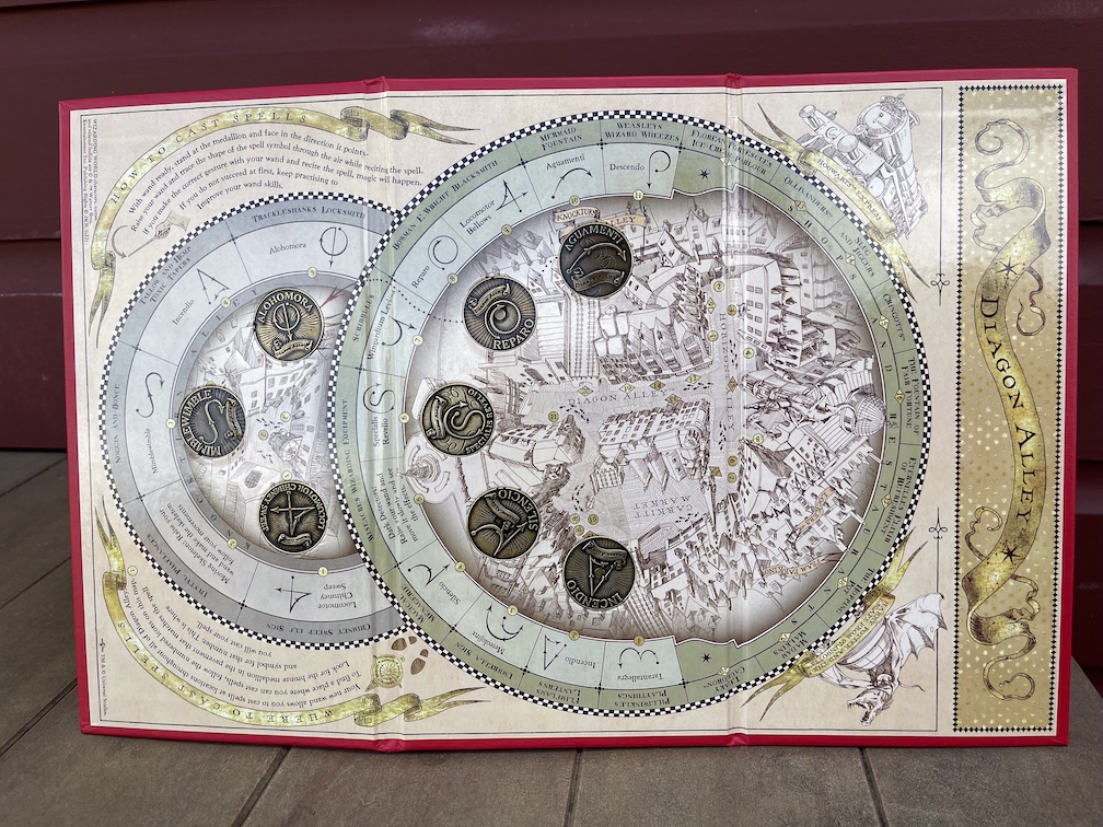 I mentioned this in the previous post but wanted to go over it again here. To help store and display your spell coins there is a special map available for purchase at the time of this post it was $22 (separate maps are available for Hogsmeade and Diagon Alley). It’s made of similar material to a Monopoly game board and has cut outs that can be removed and your coins inserted quite well to keep them from falling out. The coins are sold separately for $8 (at the time of posting). One thing I realized when trying to find all of the coins for both parks is that there are a couple duplicate spells but the coins have a banner on them that specify either Hogsmeade or Diagon Alley so just be careful when searching to make sure you get the correct coins.