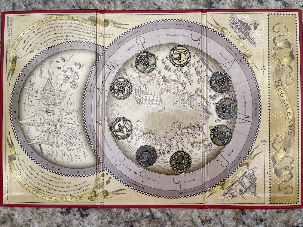 To help you store these coins once you start collecting them is a special trip-fold map. When I opened mind it reminded me of the material used to create a Monopoly game board. It’s made of cardboard but has a couple layers pressed together. There are circle cutouts that when removed will allow the spell coins to fit snuggly in place but we will look at that a little later. At the time of this post the map was $22 but also note that there are separate maps for the different Harry Potter areas, Diagon Alley in Universal Studios, and Hogsmeade in Islands of Adventure.
