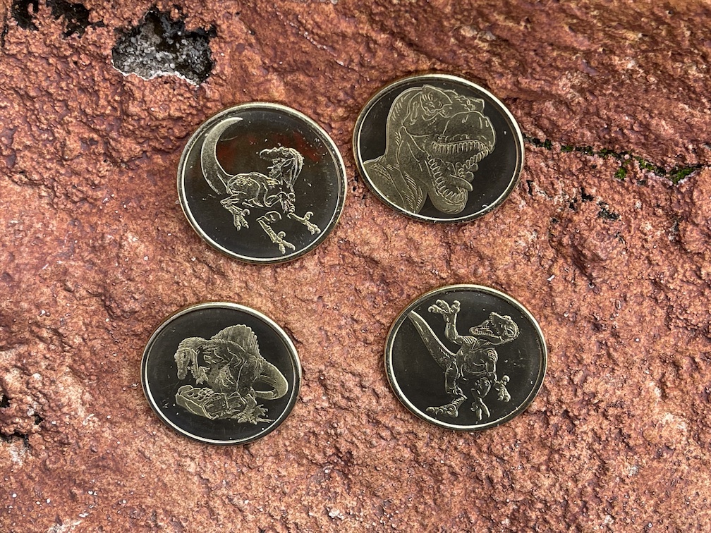 The cost of these has (so far) remained the same. $5 for one medallion, or $15 for four designs. The coins have some nice designs on them, including a couple Raptors, a T-Rex and what I believe is a Spinosaurus trashing a vehicle.