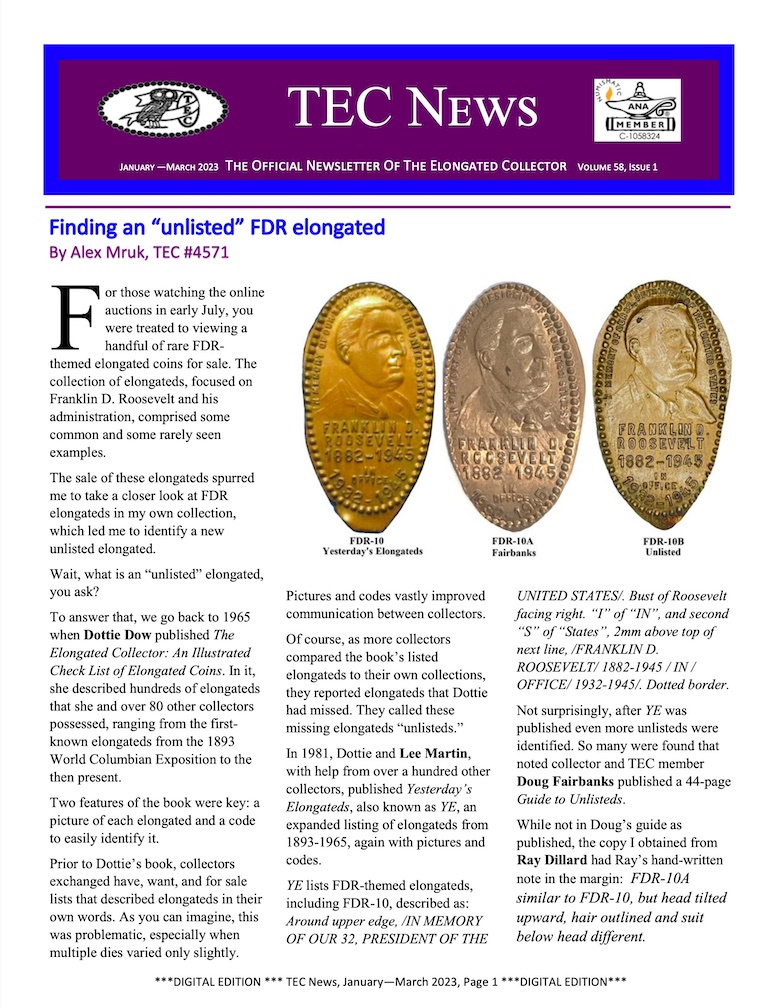 I’ve mentioned in the past there are so many great articles in each edition and I hope you are currently TEC members so you can enjoy them at home. In this post however I’m just going to be give you a closer look at the special elongated coins that accompanied this latest newsletter.