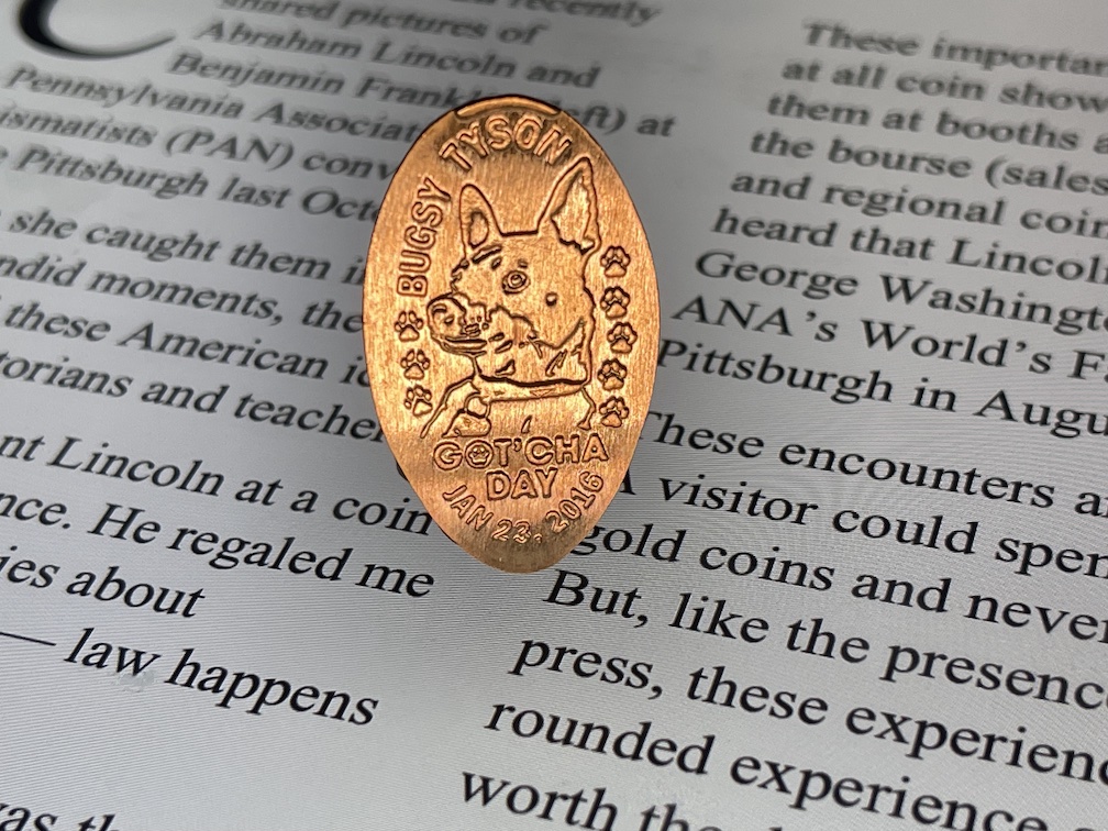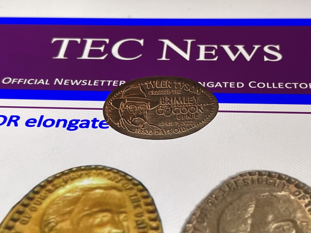 This design had me a bit confused at first until I read the explanation inside the newsletter. Anthony Wilford Brimley was a well known actor and singer who was in many classic movies including Cocoon. The Brimley Cocoon Line marks his age on the day the movie “Cocoon” reached theaters. At that time he was 18,530 days old (50 years, 9 months and 6 days). Current TEC President Tyler Tyson had passed this quirky pop culture line back in April 2022 and he created this elongated coin to commemorate that milestone.