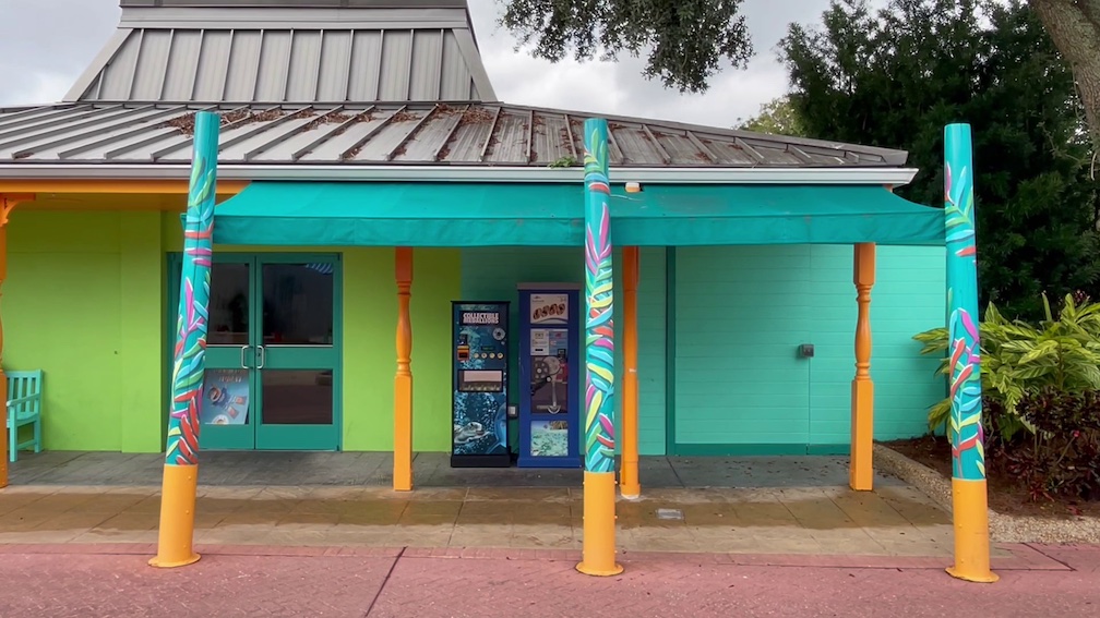 This workshop has some unique hours so due to that the machine is actually located outside the building, just along the right side wall. You will pass by it if you are heading towards the Stingray Lagoon.