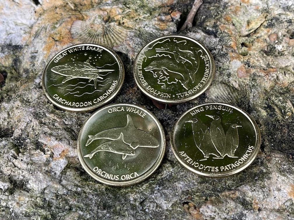 The designs on this set of medallions include a Great White Shark, Bottlenose Dolphins, Orca Whales a some King Penguins. They did include their common names, but also their more scientific names which I’m not even going to try and pronounce.