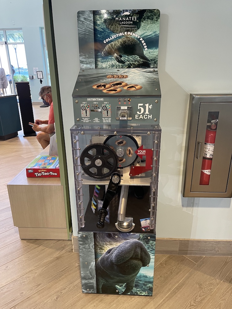 This was a standard four-design manual penny press machine with the full acrylic cabinet. The wrap decals that covered the machine were fabulous. I just really love Manatees so seeing their cute faces all over this machine just put a smile on my face.
