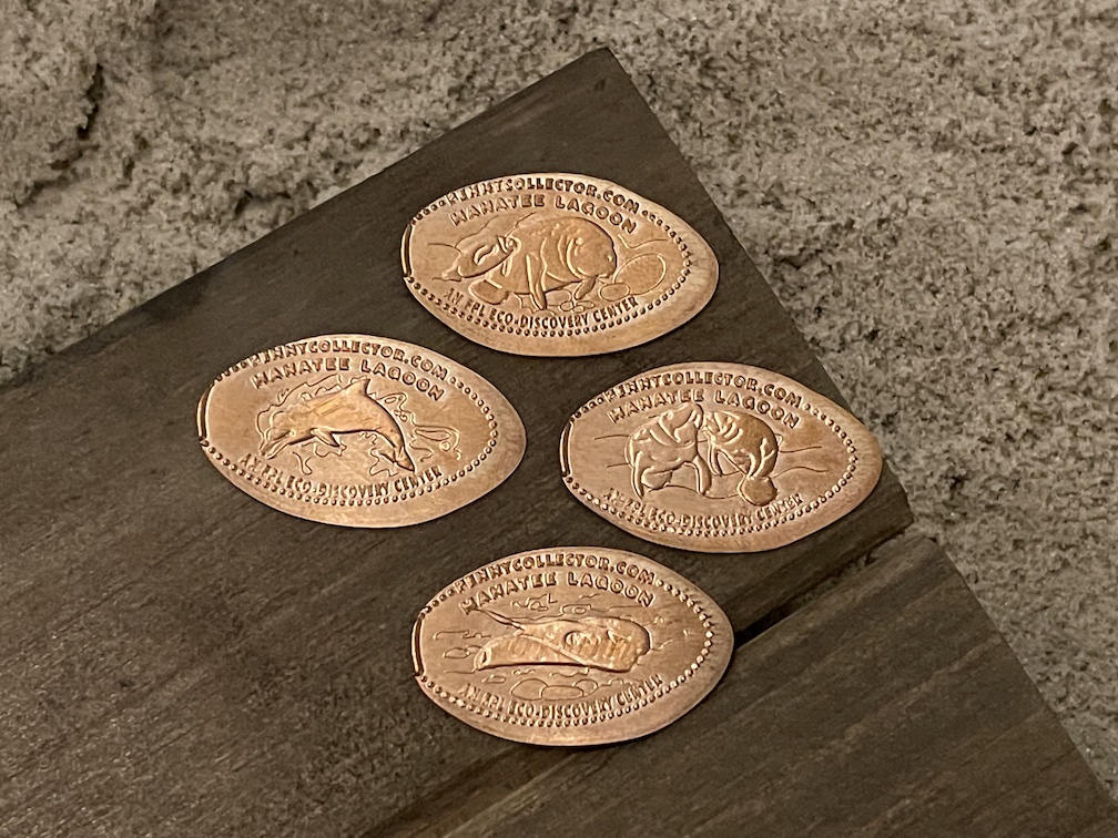 Stay tuned for a future post about what I do when I encounter an out of order machine. For now I’ll just quickly say that once I got home I mailed this location a package with some quarter and pennies asking if they could press them. Then after a few weeks the set arrived in my self-addressed stamped envelope. The designs included a couple with Manatees on them, but also a design with a Dolphin and another with a Stingray.