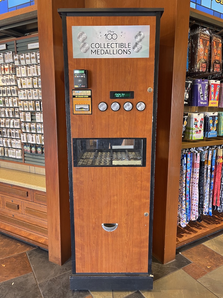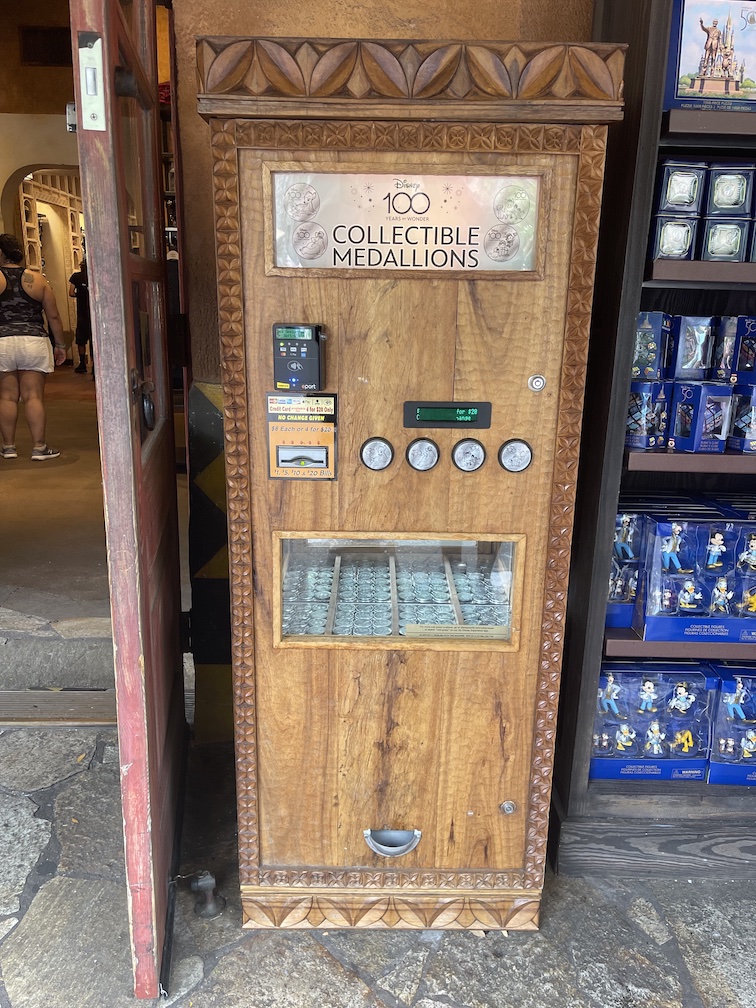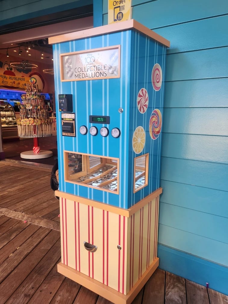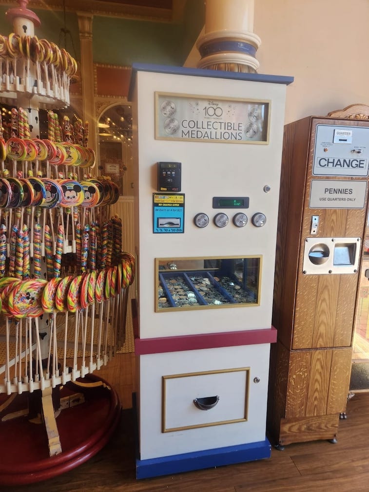 The Pin Trader store is located in the general area of Rainforest Cafe, Earl of Sandwich and the Carousel. Inside there are quite a few penny machines, but only one Medallion machine that is pretty easy to spot as you walk around the store. The medallion designs available here include Pooh & Piglet, Woody, Black Panther and Grogu (Baby Yoda).