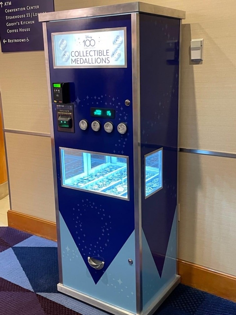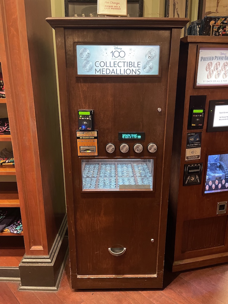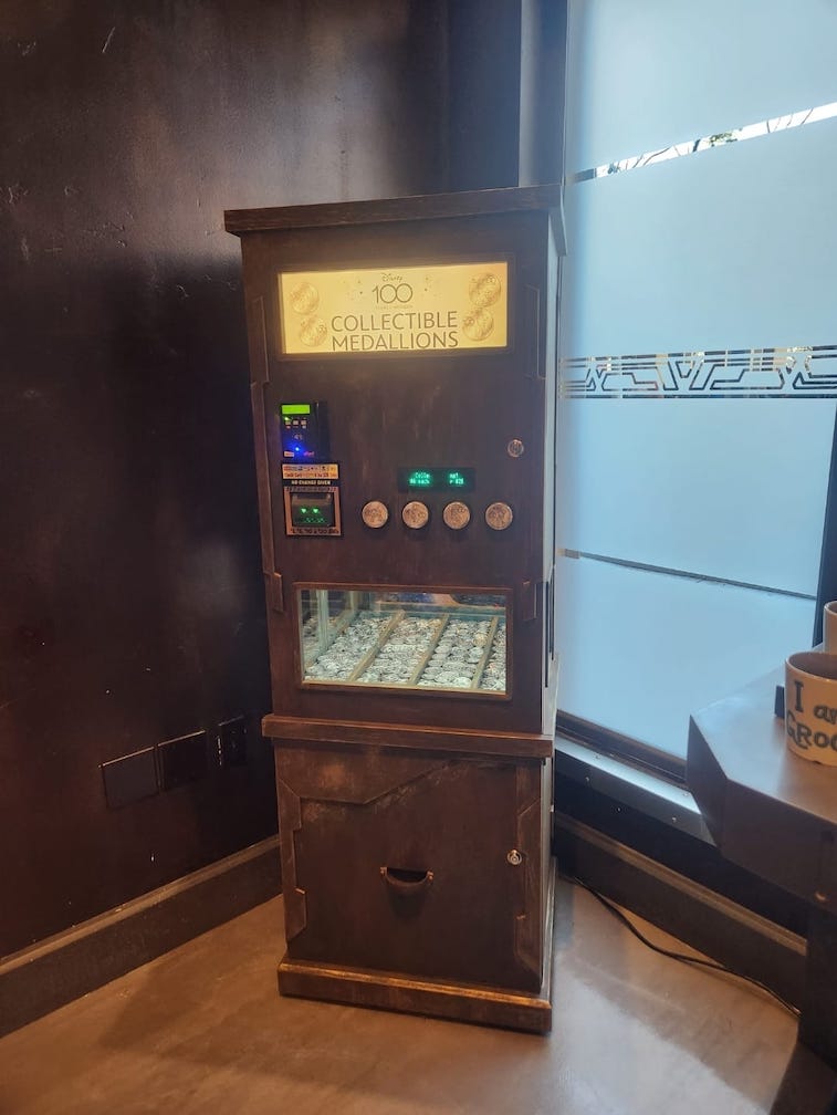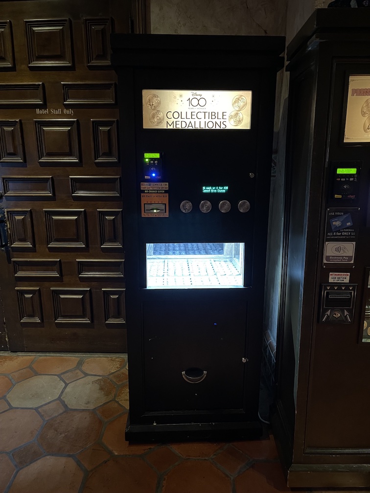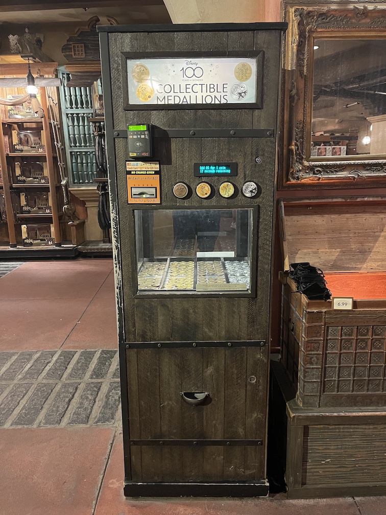 Next head down Sunset Boulevard towards the Tower of Terror attraction. Don’t worry you don’t need to ride the attraction if you don’t want to. Continue past where the line starts into a courtyard and there will be an entrance/exit to the Tower Hotel Gift shop. Go all the way through the gift shop towards where the ride exits and you will find the machine along one of the walls. The 100th anniversary medallions available here are of Maleficent, Lumiere & Cogsworth, Kermit the Frog, and R2-D2.