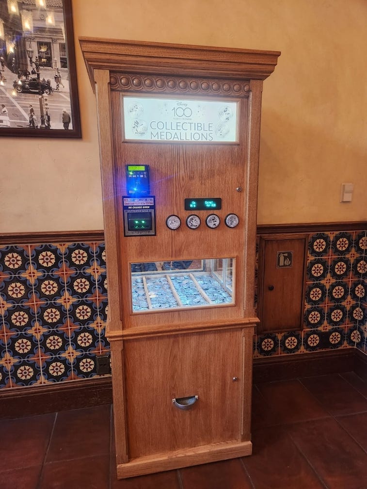 This next machine is in a bit of a unique location although you can see in the photo above there is a penny press here as well. We are calling this location the Adventureland Breezeway that connects to Liberty Square. This is also where you can find the restrooms just across from the Swiss Family Treehouse. Medallions in this machine have designs of Captain Hook, Lady & the Tramp, Jasmine & Abu, and Madame Leota from The Haunted Mansion.