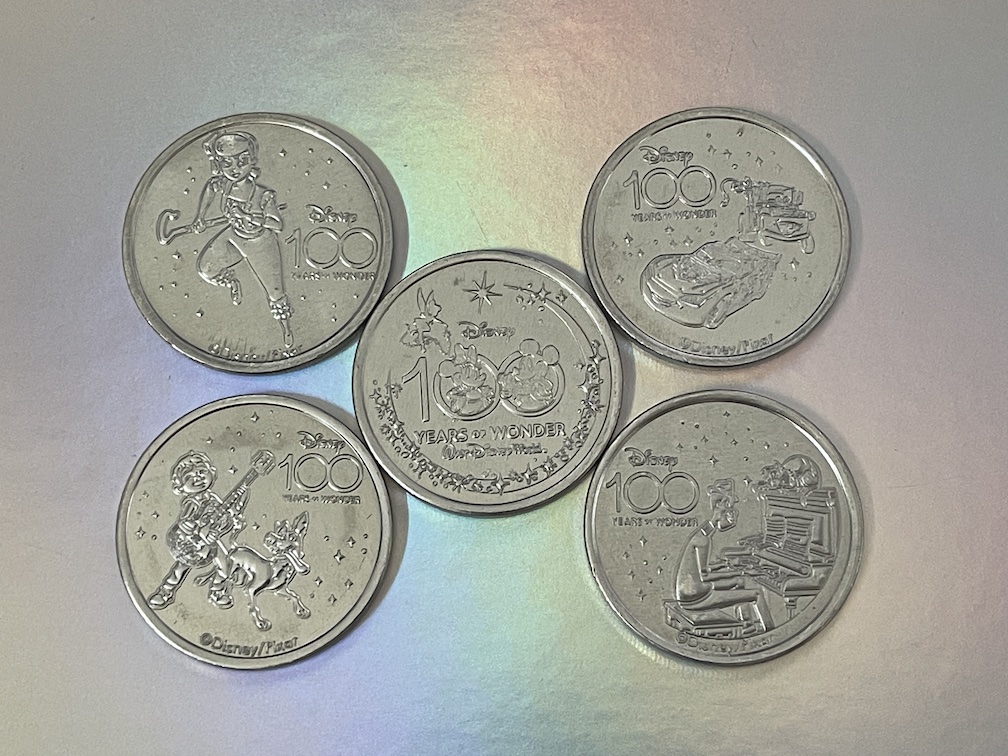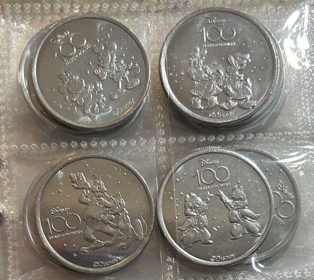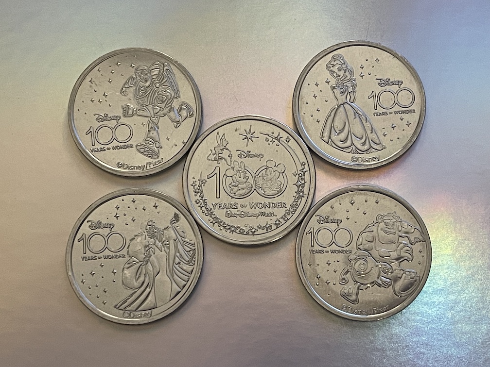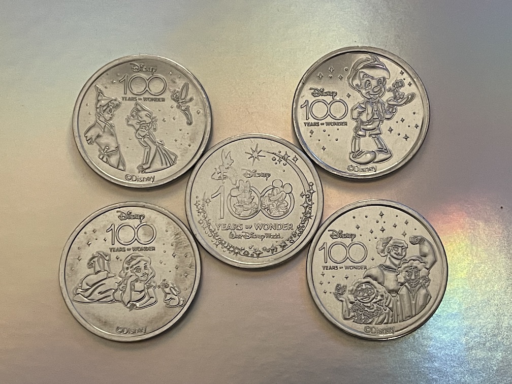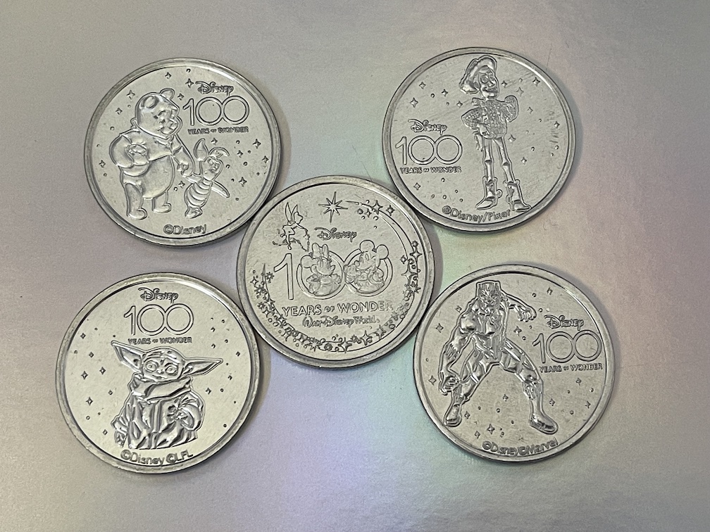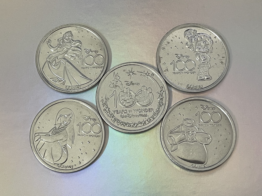 Starting January 27th, 2023 Disneyland out in California has begun celebrating the 100th Anniversary of the Walt Disney Company. There are plenty of new decorations, performances, special food and lots of souvenirs including a brand new set of Souvenir Medallions. I did want to mention that the price has gone up with this latest series, they now cost $6 for one coin, or $20 for the full set of four at each machine. Start saving now because this may be quite an expensive set to acquire.