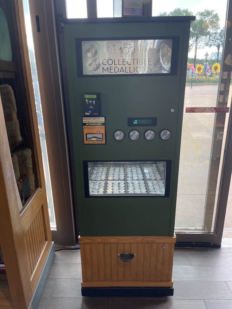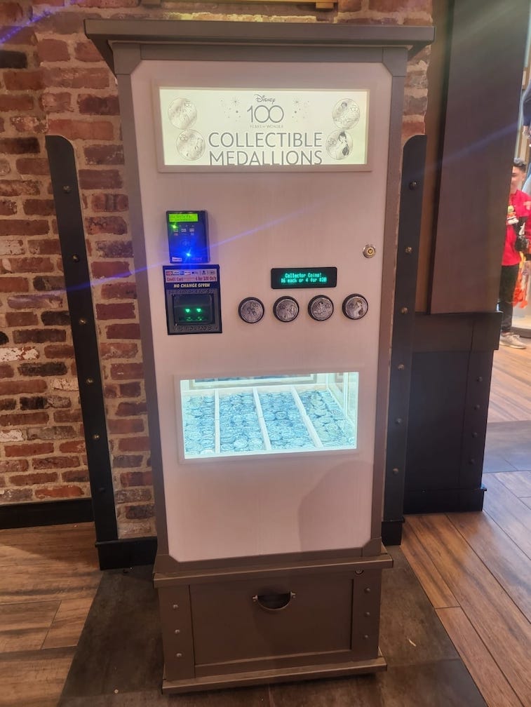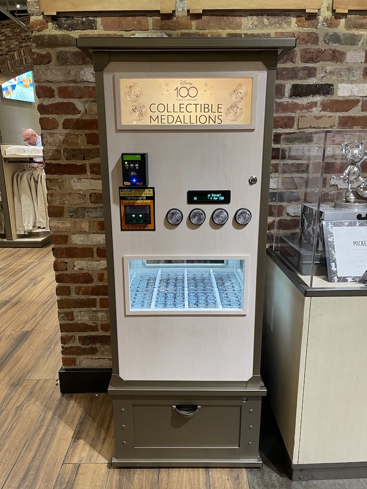 When visiting the World of Disney store if you enter through the center set of doors that would be closest to the Waterside Stage the machine is just inside along one of the walls. The medallions available in this machine feature Cinderella, Rapunzel, Dumbo & Timothy, Joy Sadness & Bing Bong.