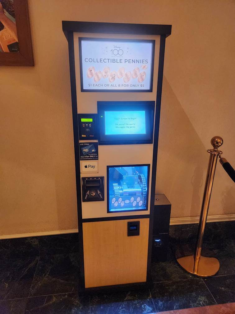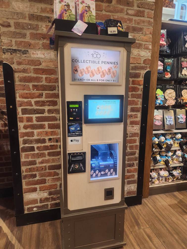 Here in the large World of Disney store is a newer 8-design pressed penny machine. All 8 of the available designs are now 100th Anniversary themed with many classic Disney Characters including Mary Poppins, Simba, and fan favorite Marie from Aristocats.